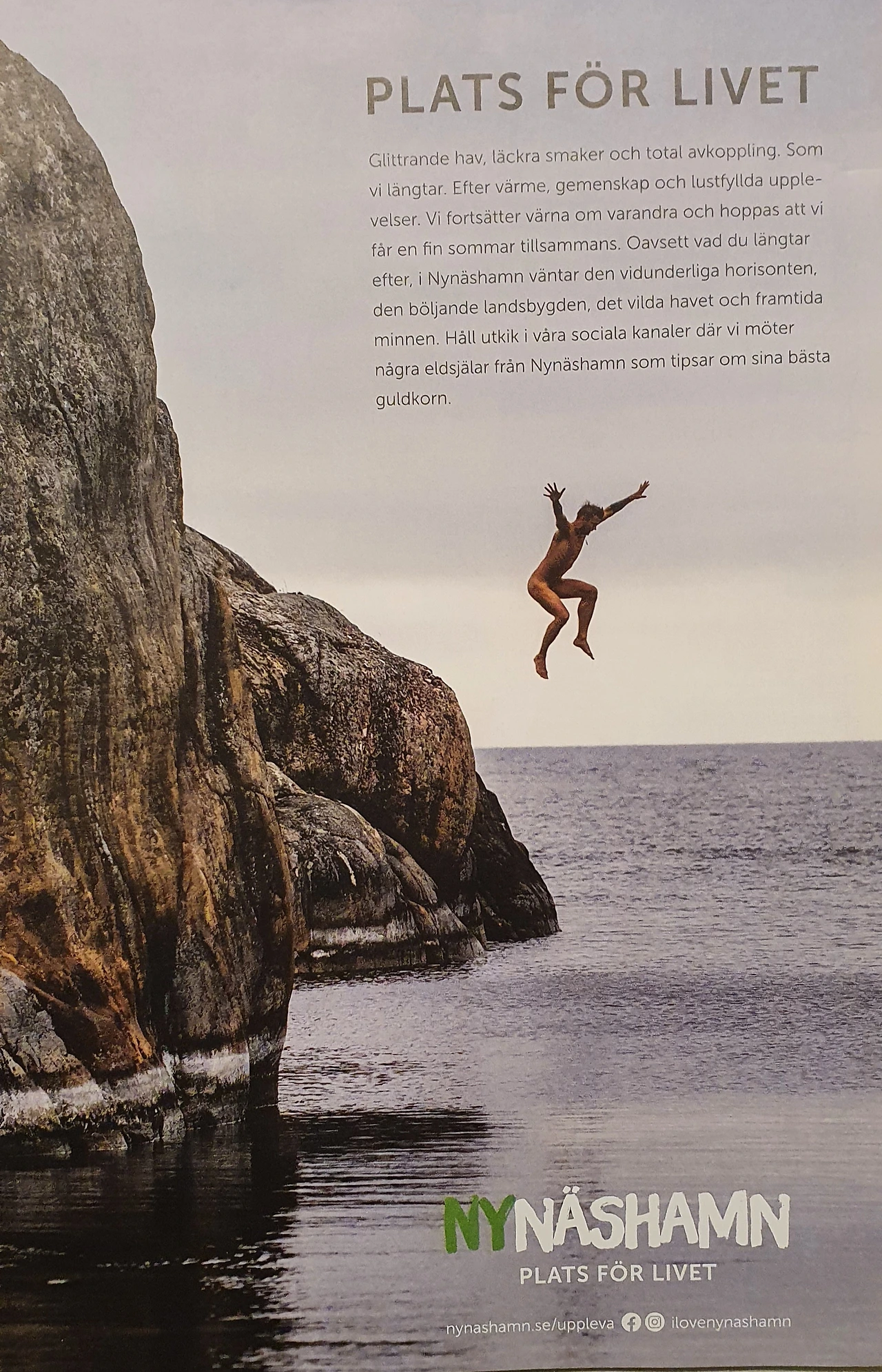 Nynäshamn시 소개 책자에 한 사진. 남들 신경 안 쓰고 일단 뛰어내리는 남자.