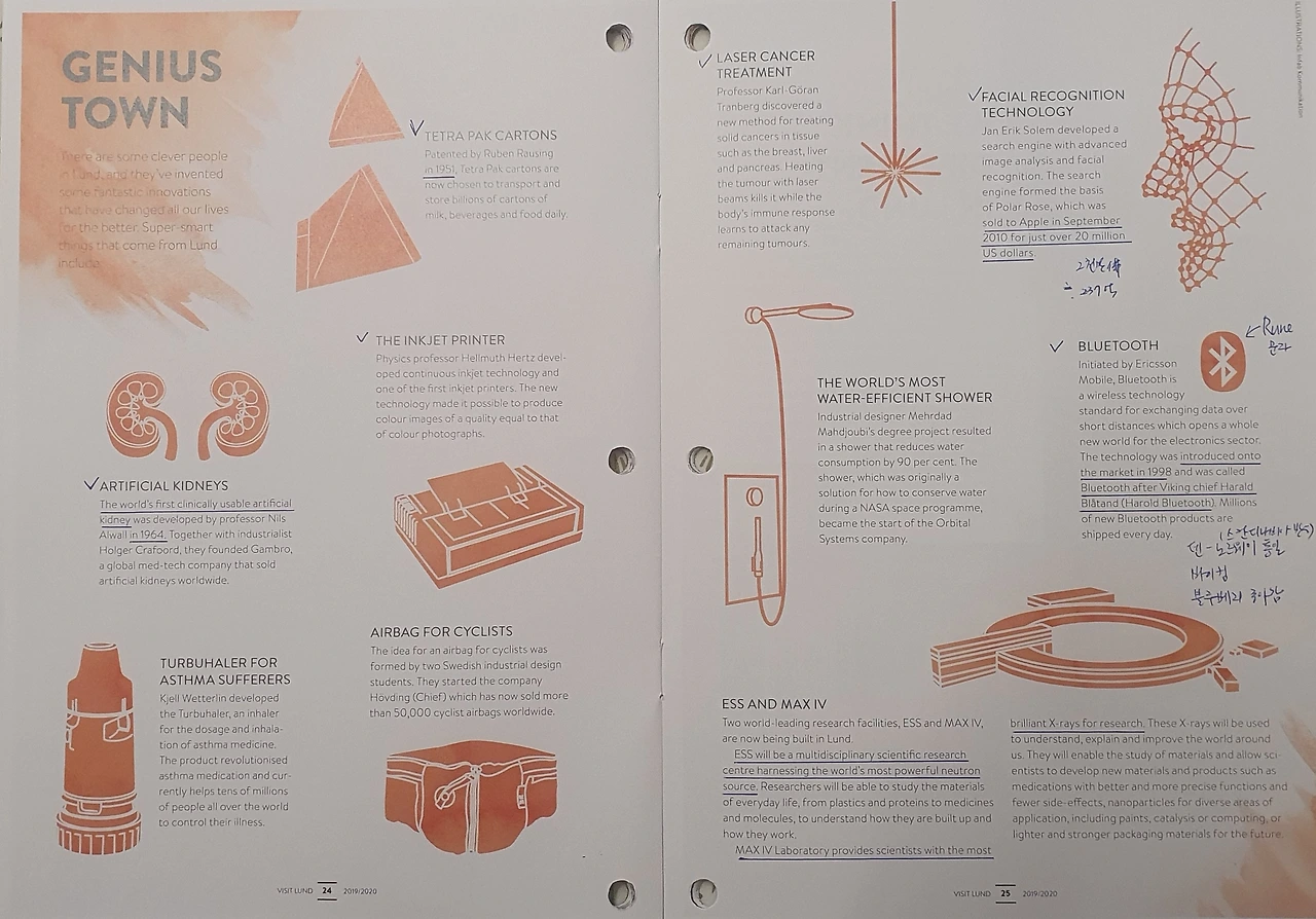 룬드는 도시 전체가 대학으로 구성돼있고 그냥 공부하라고 만든 걸로 착각할 만큼 학구적인 도시다 보니 룬드대학교나 그 출신 또는 지역이 배출한 천재적인 발명들이 많은데, 의료용 인공신장, 테트라팩, 연속 잉크젯 프린터, 천식 환자용 호흡기, 암 치료를 위한 레이저, 안면인식 기술, 블루투스, 방사광가속기 등 한 지역에서 이렇게 많은 발명품이 나오기가 드물지 않나 싶어요.