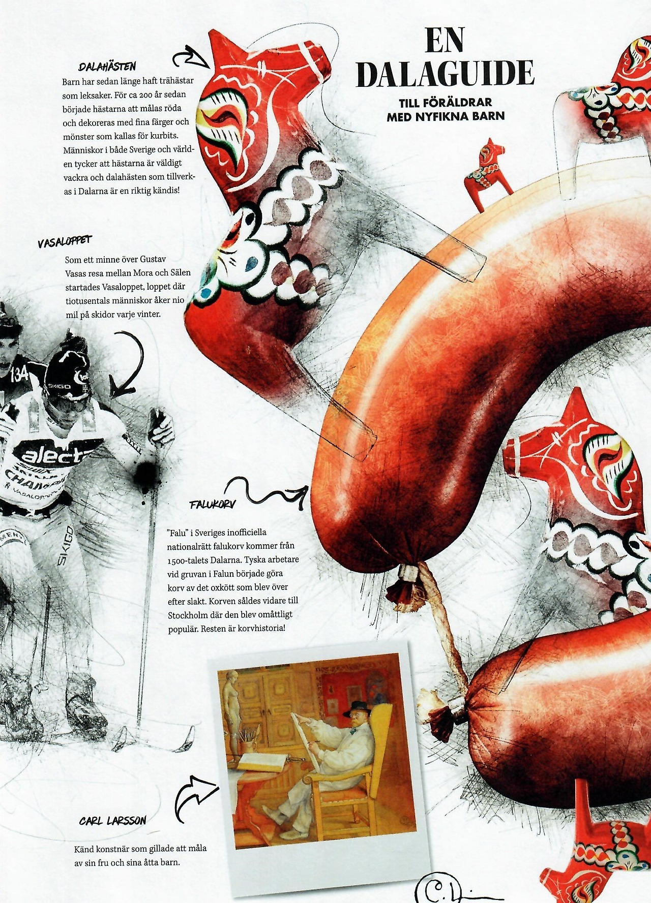오후 서너 시만 돼도 어둠이 찾아오는 길고 긴 스웨덴의 겨울밤, 집 안 장작불에 앉아 있던 아버지가 귀여운 자식들을 위해 뭔가 해줄 것을 생각하다, 흔하디 흔한 땔감 나무토막 하나를 깎아 말의 형태를 만들었다. 왜 하필이면 개나 소도 아니고 말일까?