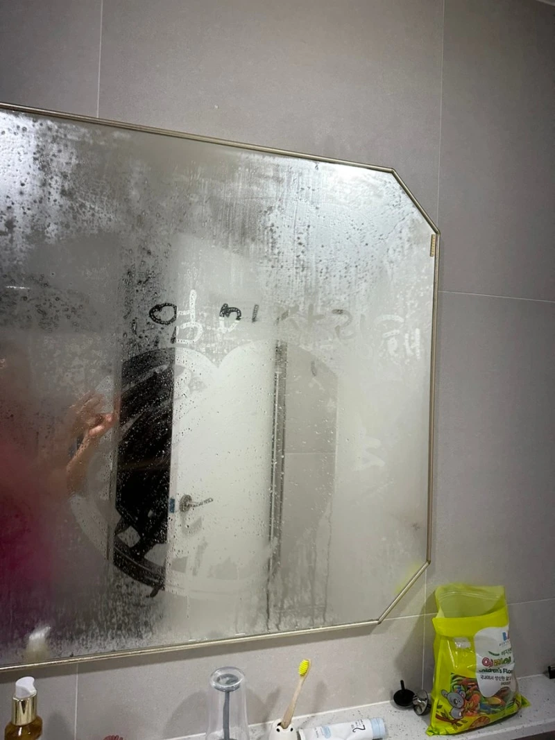 김서린 목욕탕에 해맑게 거울에 막내가 신나게 그리고 있길래 돌아보니, 큼직한 하트와 엄마 사랑해. 사랑고백.