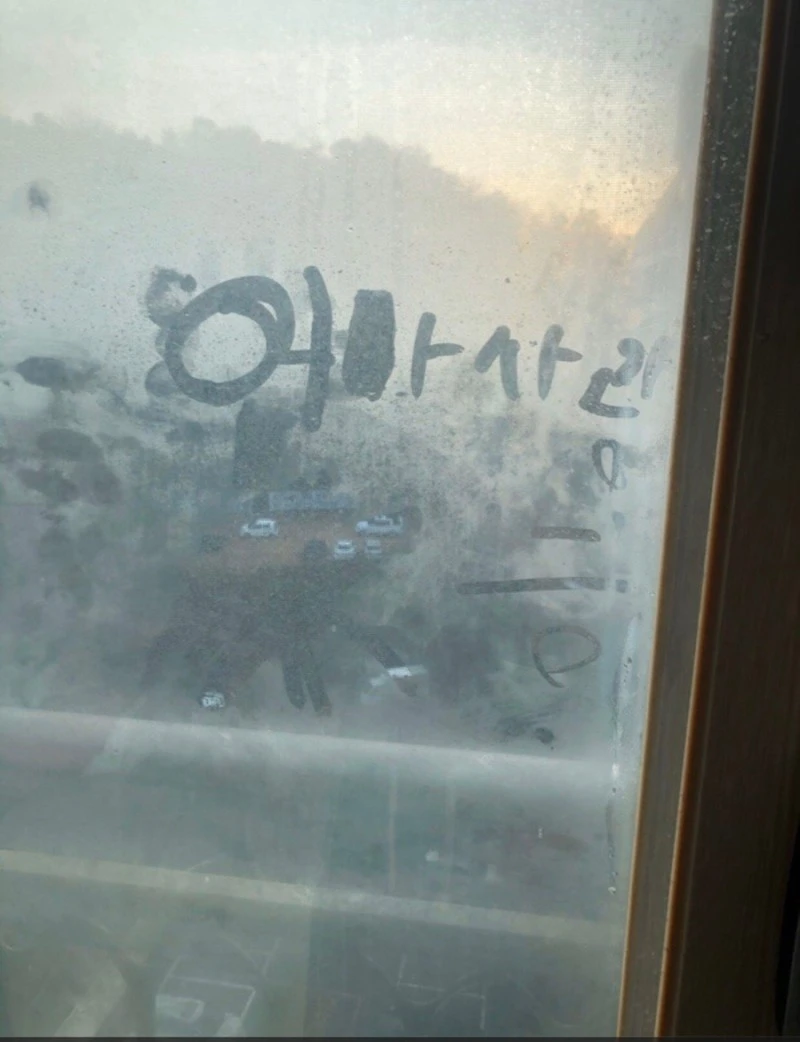 밤새 애들 셋에 이리 치이고 저리 치여 제대로 잠을 못자서 아침에 못 일어나서 늘어져 있는 동안, 무뚝뚝한 첫째가 창문에 남긴 낙서. 아니, 사랑고백.