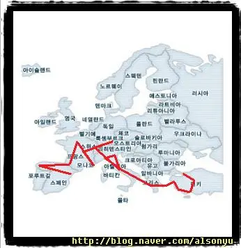 터키 -> 그리스 -> 이탈리아 -> 스위스 -> 독일 -> 프랑스 -> 스페인 , 산티아고 드 깜포스텔라.