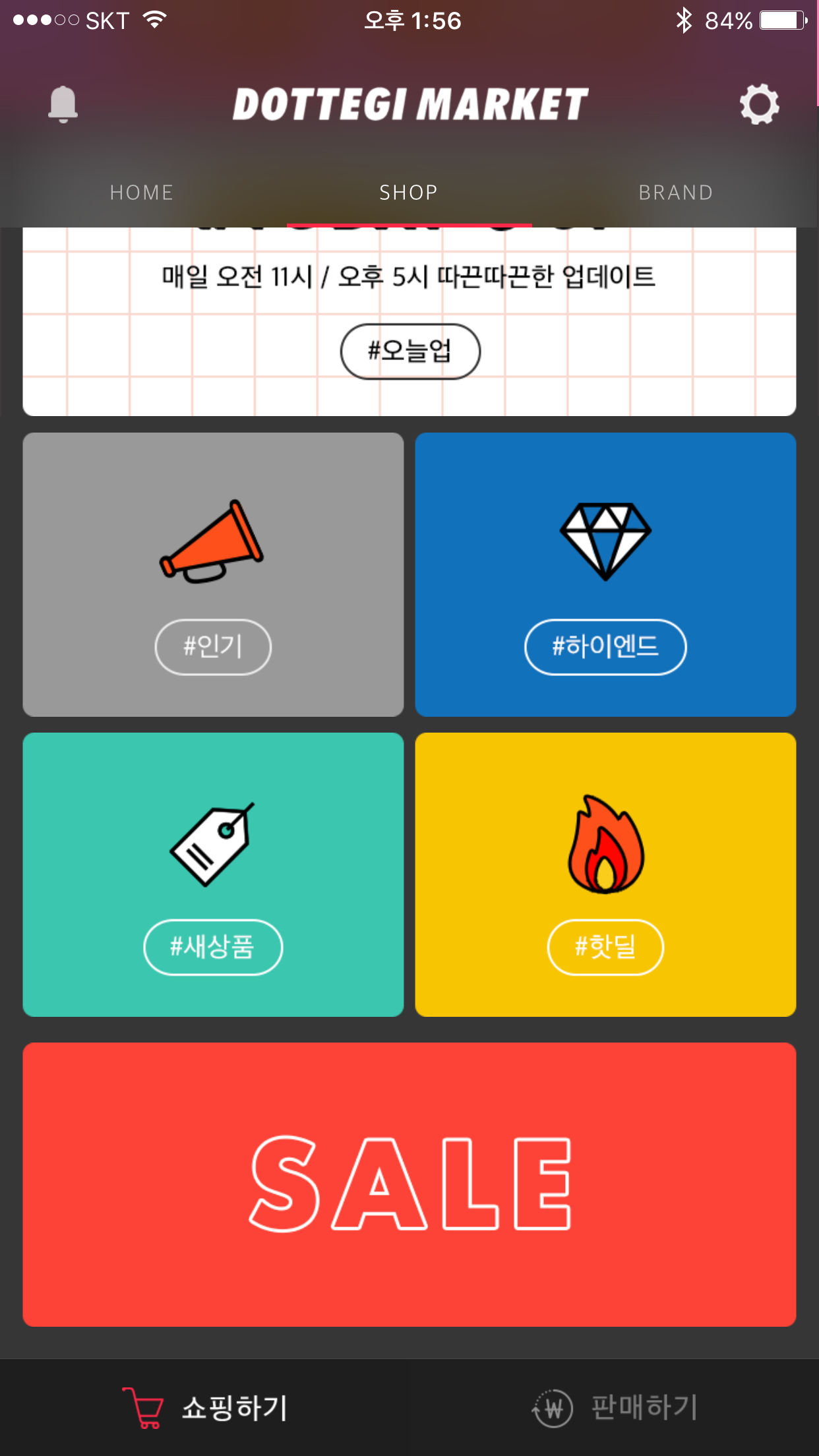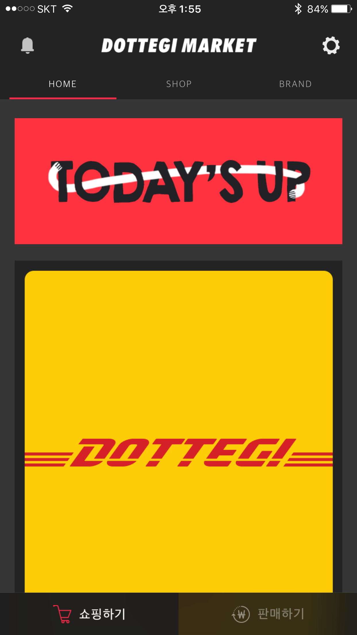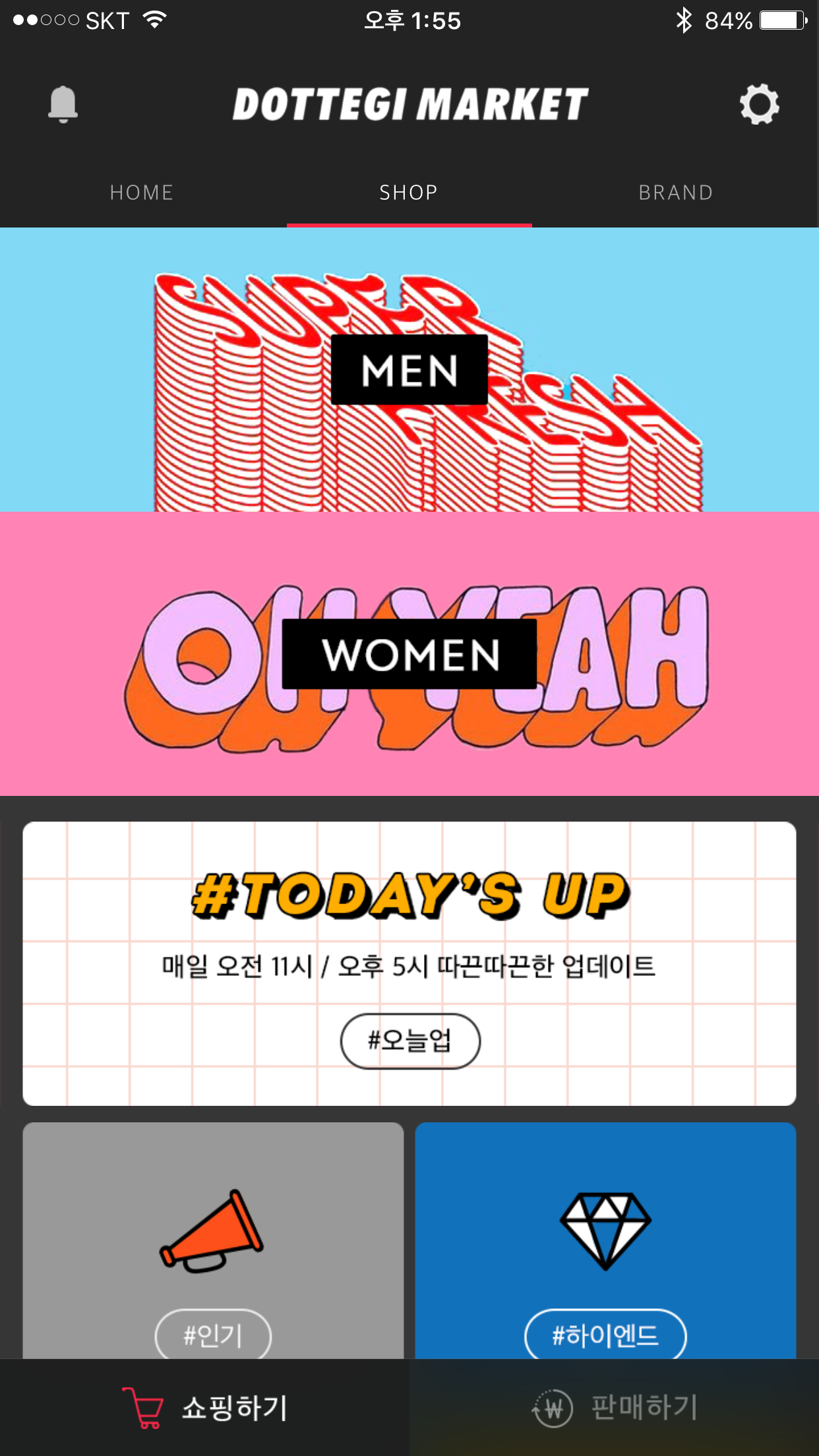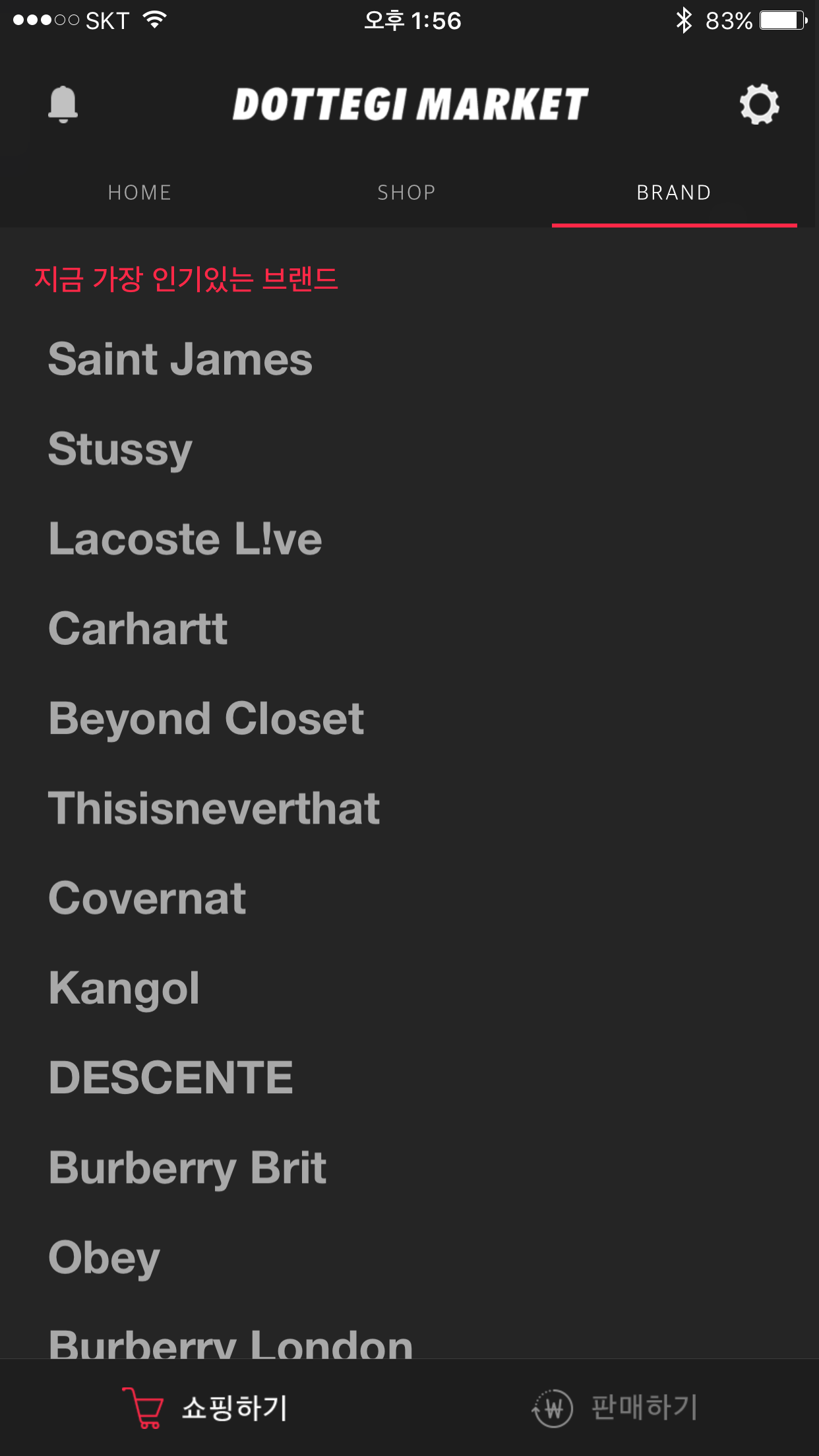 모바일 앱을 통해 물건을 고르고 구매했다. 메인 탭은 HOME/SHOP/BRAND로 나눠져 있다. 일반적인 쇼핑몰같이 최상단에 검색창이 있진 않았다. 검색보다 큐레이션에 더 신경을 쓰는 모양새였다.