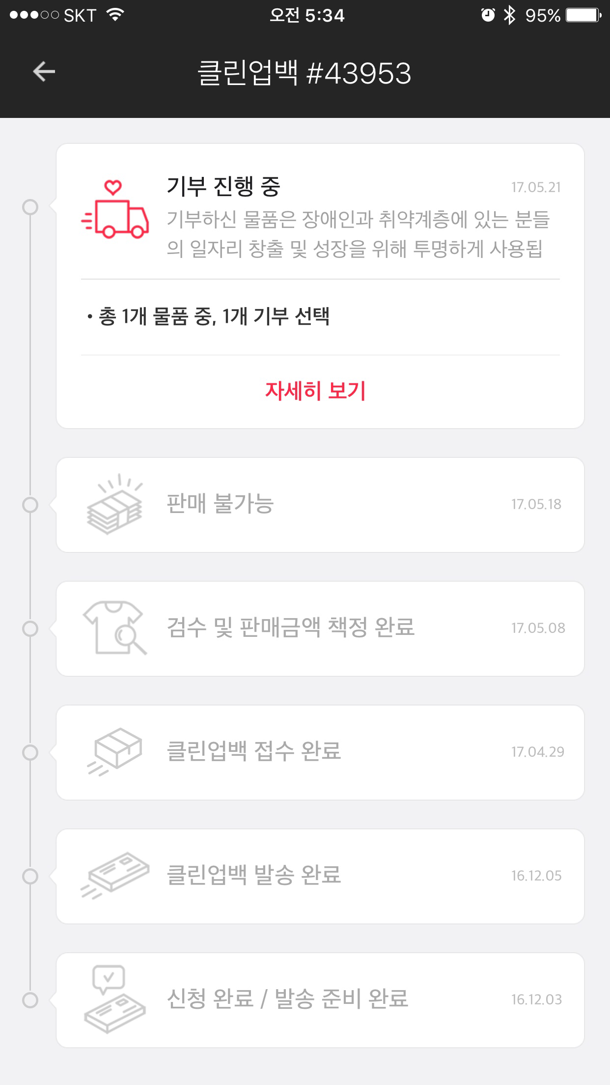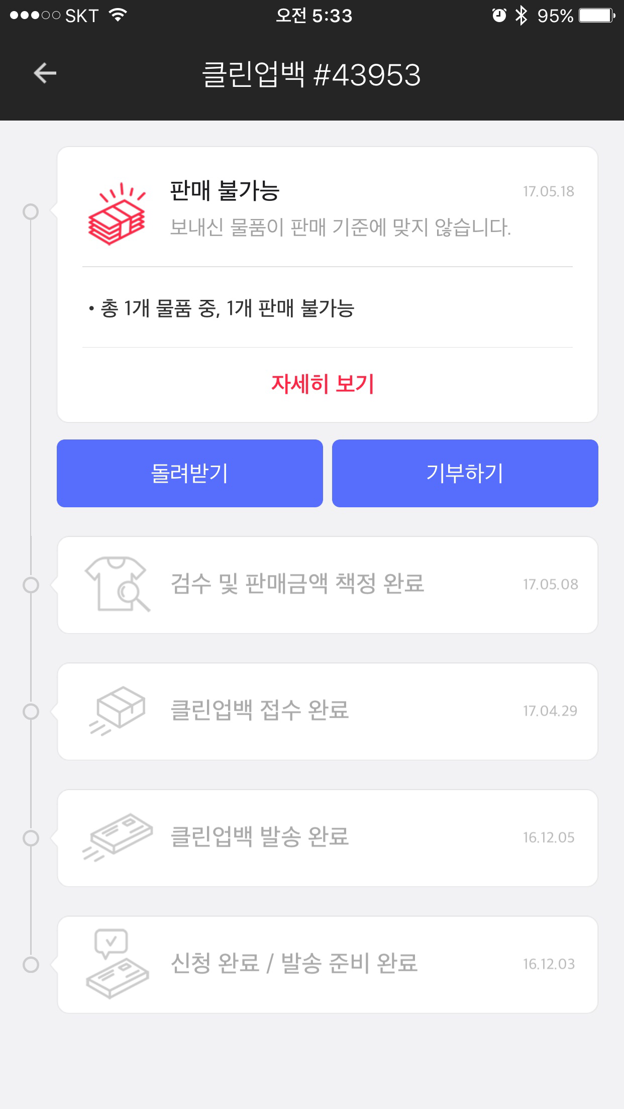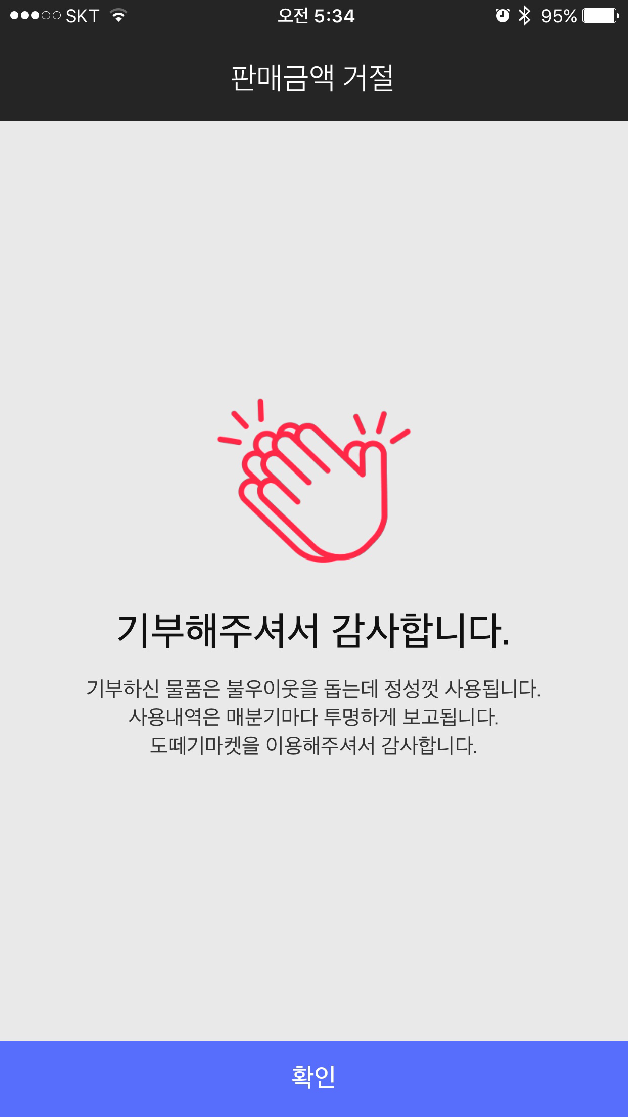 거래가 성사되지 않으면 입력한 주소로 착불 발송을 물어보게 된다. 택배비 3,000원도 아깝긴 하지만 어차피 돌려받아도 입지 않을 제품이라 기부하기 버튼을 눌렀다. 기부하기로 결정된 상품은 불우이웃을 돕는데 쓰여진다고 한다.