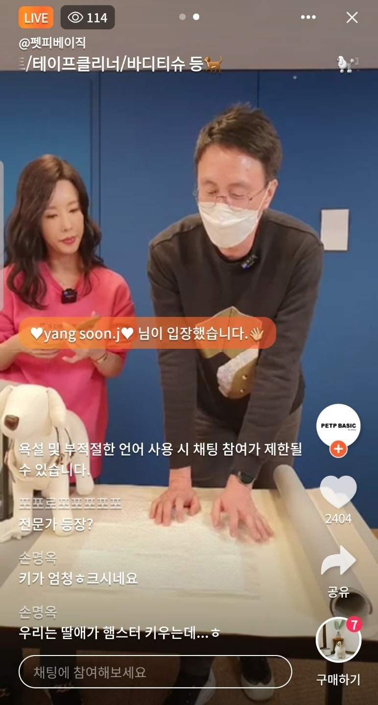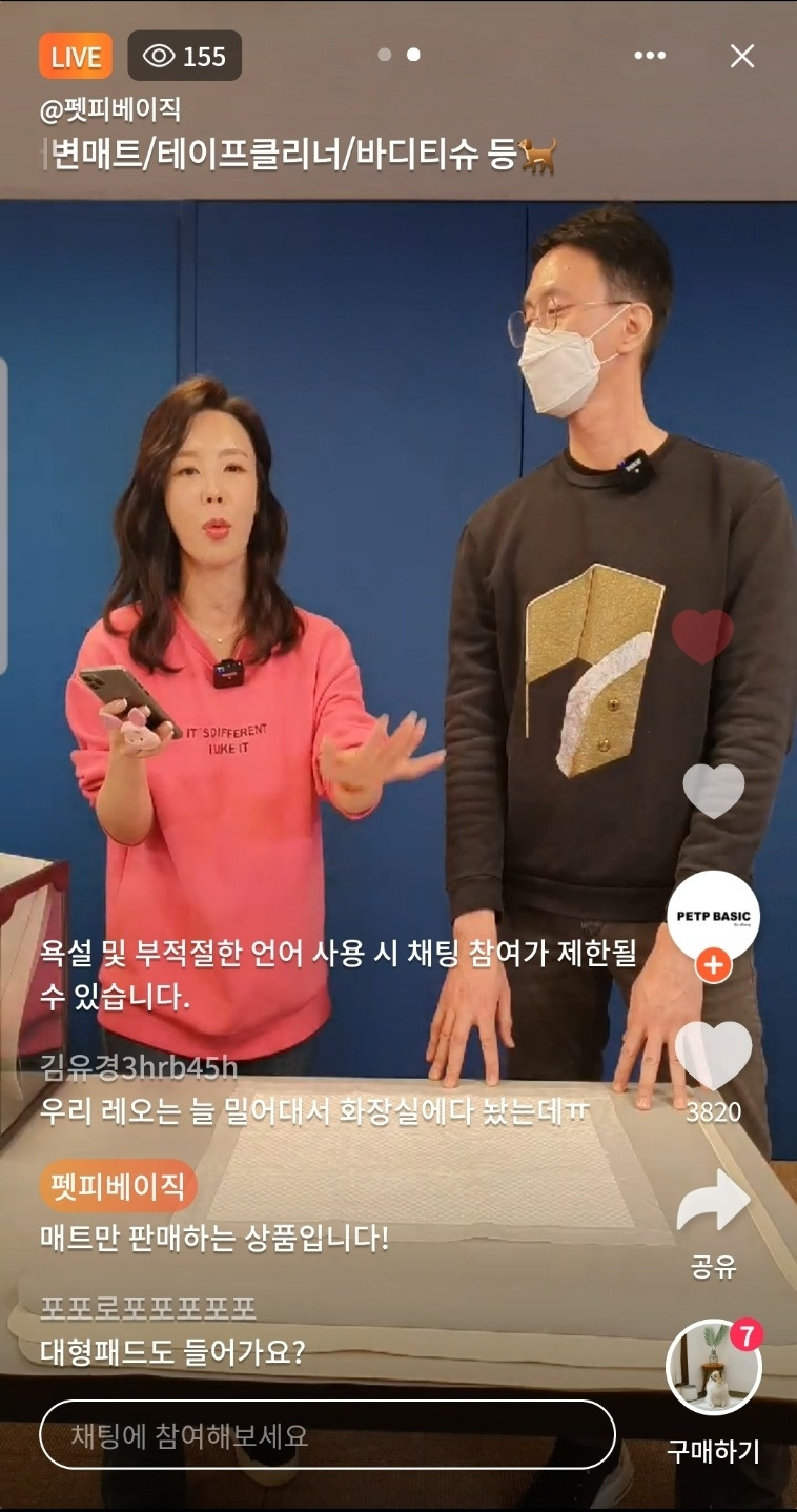 '펫피 베이식' 주력제품 3종을 준비했고, 마침 일산 케이펫 페어가 끝난 지 얼마 되지 않아 온라인 펫 박람회 콘셉트로 진행했다. 콘텐츠 기획에서 가장 신경 썼던 부분은 3가지 제품을 준비해서 진행하다 보니 제품마다 시간 안배를 어떻게 할 것인가와 생방송하는 동안 공감할 수 있는 키워드와 내용을 어떻게 가져갈 것인가였다.