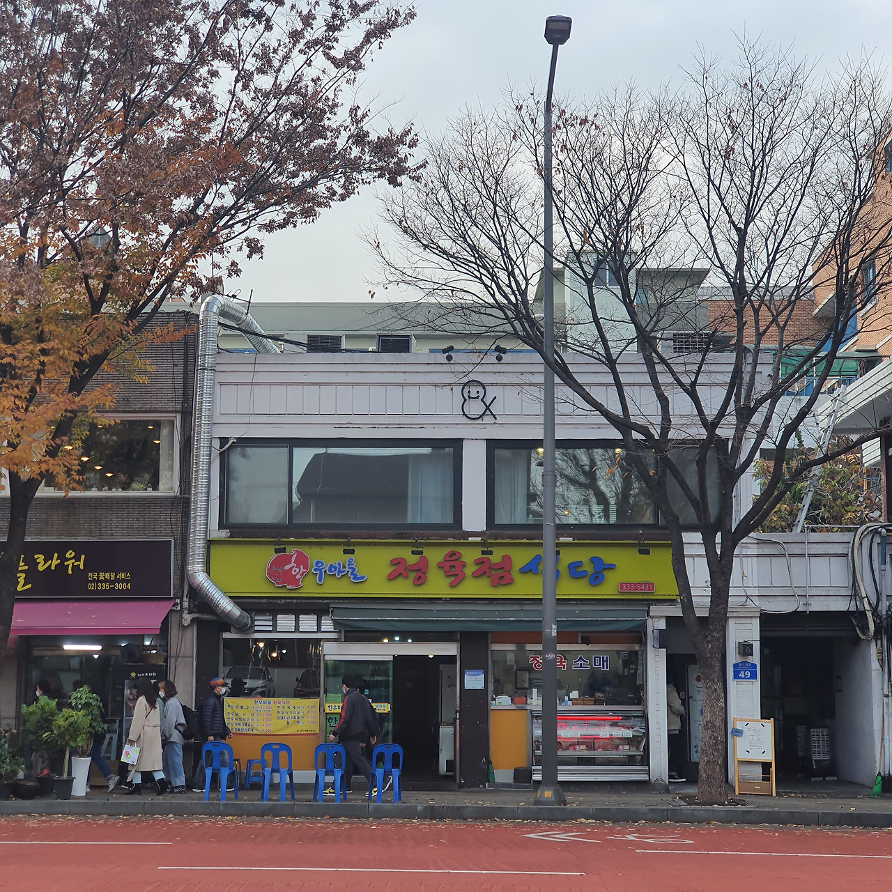 대부분 네이버 지도나 인스타그램을 보고 찾아왔을 것 같은데, 맵에 2층이라는 언급만 되어 있어도 찾기가 수월했을 것 같다. 정육점 식당 앞으로 가니 작은 간판이 있긴 한데...