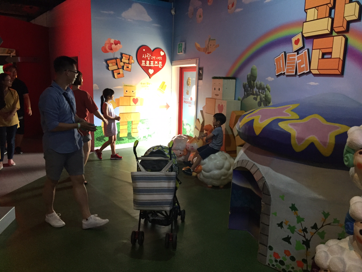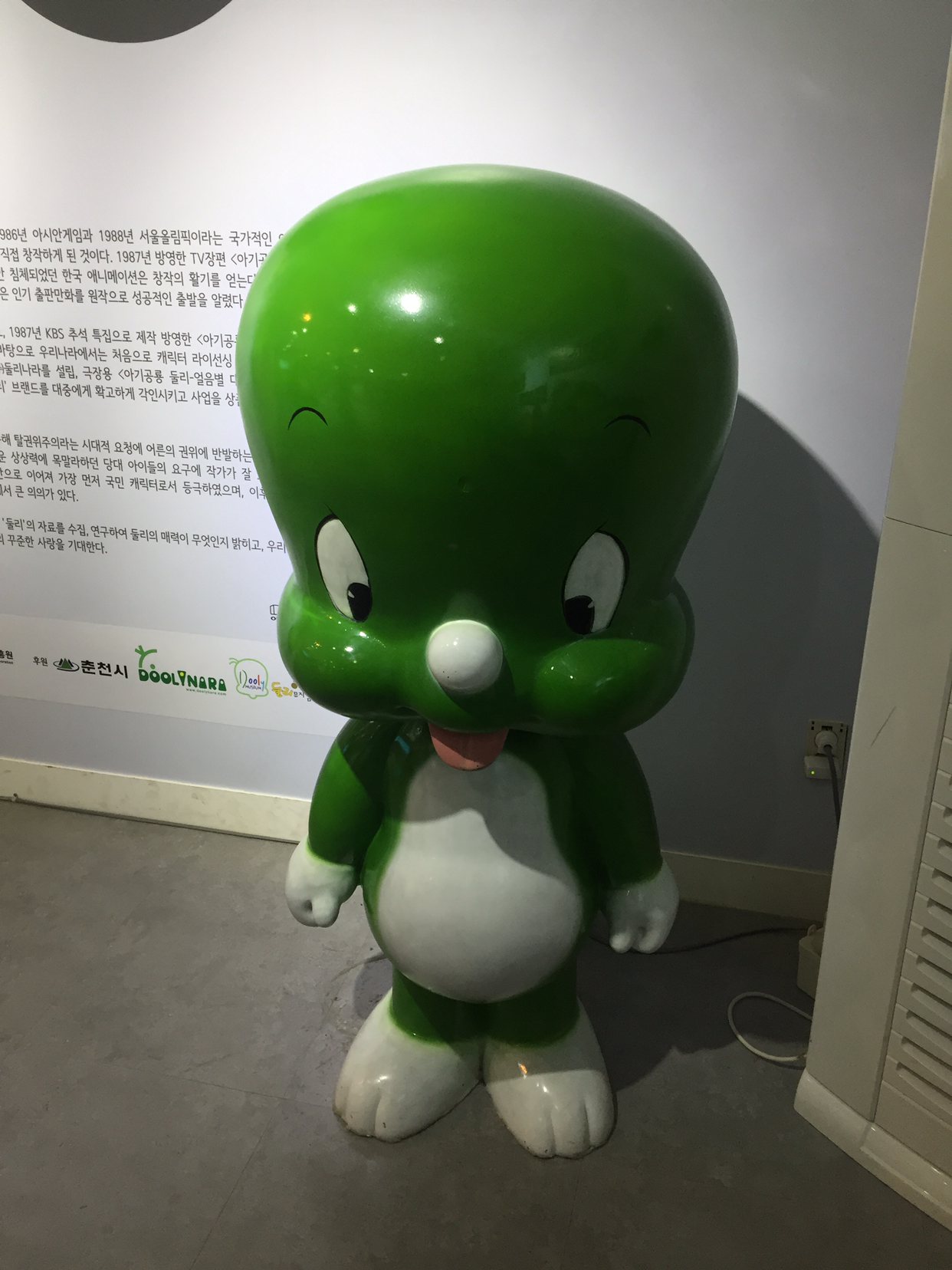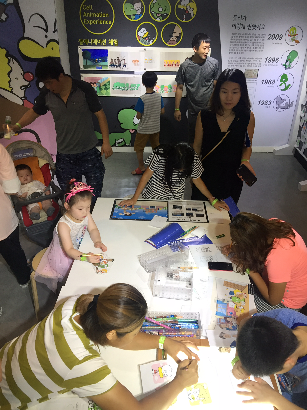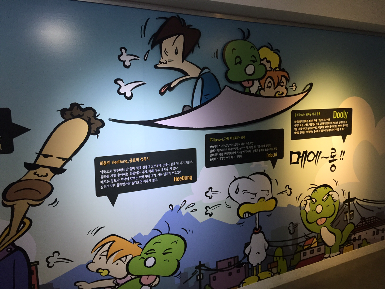 가장 반가웠던 캐릭터는 둘리! 보물섬에 연재되었던 원본도 전시되어 있었고 KBS에 애니메이션으로 만들었던 히스토리와 실제 방송에 에피소드를 비디오로 보여주고 있었다. 특히 둘리 캐릭터로 그림을 그리고 색칠할 수 있는 장소가 마련되어 있어서, 애들이 좋아하는 장소였다. 몇개 그림을 더 그리는 바람에 꽤 긴 시간을 머무를 수 있었고, 그 덕분에 둘리에 관한 히스토리와 캐릭터 변천사를 자세히 볼 수 있었다.
