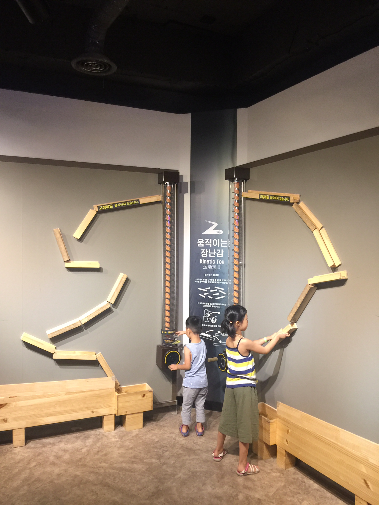 2층은 다양한 장난감으로 채워져 있었다. 특히 쇠구슬을 올려서 밖으로 떨어지지 않게 블록을 구성하는 장난감은 단순하지만 재미있었다. 애들과 사뭇 진지하게 어떻게 구성을 해야 쇠구슬이 이탈하지 않고 바닥까지 옮겨갈 수 있을지 여러가지 실험을 했다.
