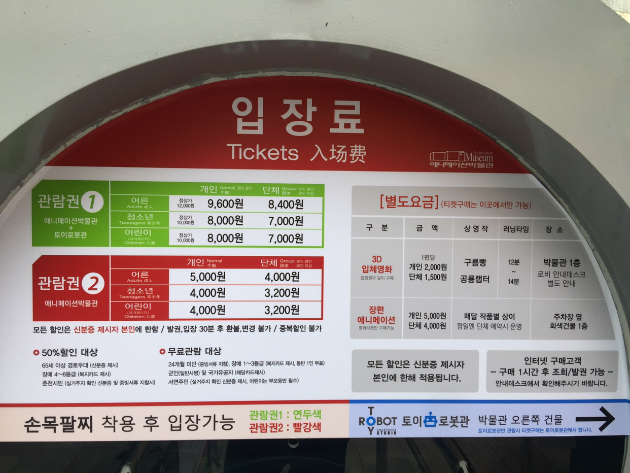 톨게이트를 빠져나와 애니메이션 박물관까지 들어가는 길은 막히지 않았다. 네비가 인도해준 대로 쉽게 찾아갈 수 있는 곳에 위치해 있었다. 주차장도 넓은 편이었고 내려서 박물관까지 가는 길도 넓고 쾌적하게 만들어져 있었다. 입장료는 애니메이션 박물관과 토이로봇관을 같이 들어갈 수 있는 코스가 어른 9,600원, 청소년 어린이 8,000원이었다. 3D 입체영화도 볼 수 있었는데 별도 비용을 내야 관람할 수 있었다.