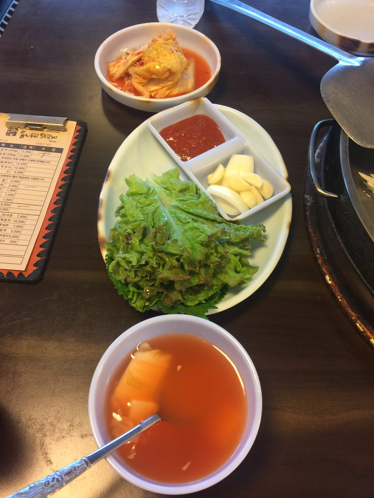 밑반찬은 아주 심플했다. 상추, 마늘 조금과 배추김치와 물김치가 전부였다. 배고프다는 애들의 원성에 감자전을 시켰다. 겉은 바싹하고 속은 아주 부드러워서 닭갈비가 익는 시간동안 천천히 입가심으로 먹기에 충분했다. 메뉴가 많지 않고 닭갈비를 조리하는 시간을 고려해보면 다른 간단한 메뉴가 더 있으면 어떨까 싶었다.