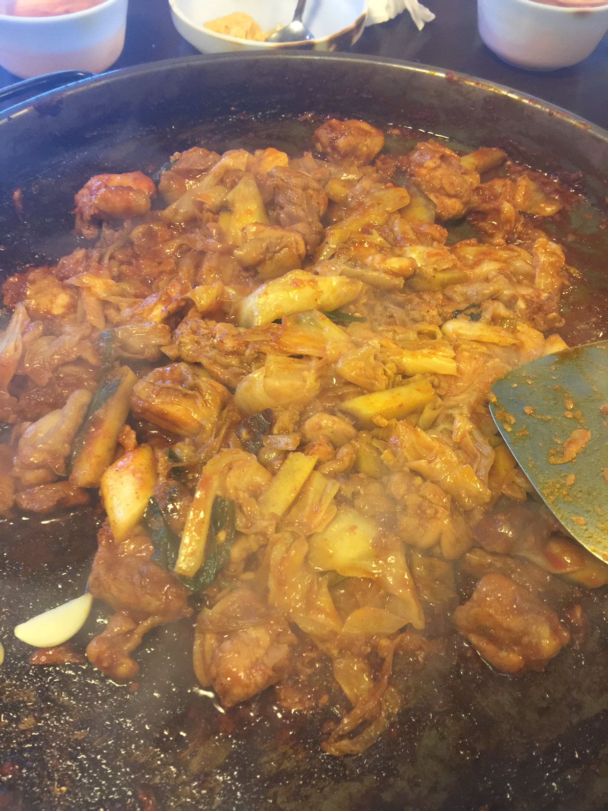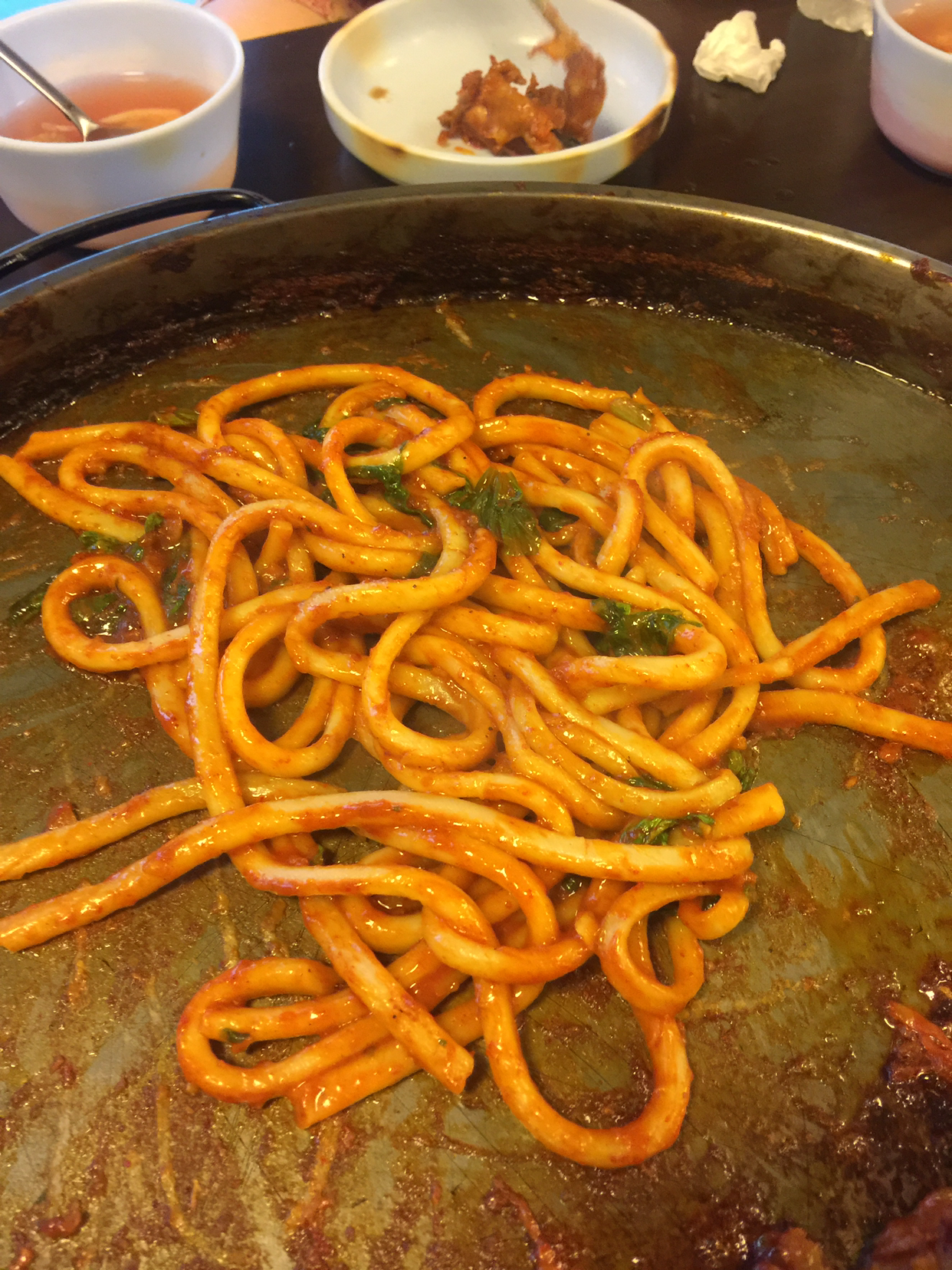 닭갈비가 완성되었다! 매운걸 못먹는 애들이라 씻어 줘야 하나 싶었지만 달짝지근한 맛이 섞여있어인지 그냥도 잘 먹었다. 손을 입에 대가며 맵다고는 하는데 밥이랑 같이 잘 먹었다. 수북해 보이던 양배추는 쪼그라드니 양이 얼마되지 않았다. 맛있어서인지 닭갈비보다 양배추 양이 다소 부족하게 느껴졌다. 밥을 볶을까 우동을 볶을까 하다가 옆테이블에서 먹고있는데 맛있어 보였던 우동을 택했는데, 생각보다 실망스런 맛이었다. 닭갈비의 양념과 우동의 양념은 달랐고 입안에서 맛이 따로 노는 느낌이었다.