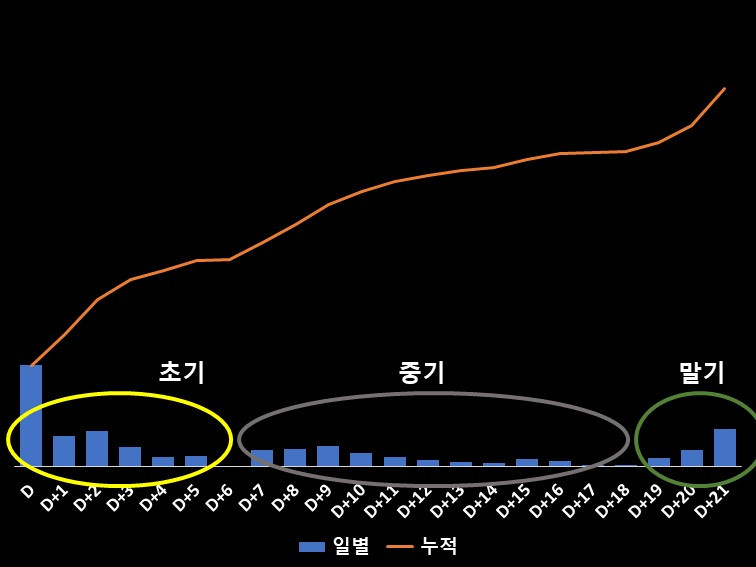 총 21일간의 프로젝트 기간이 순탄하게 진행되지만은 않았다. 아래 일별 펀딩 금액을 보면 아시겠지만 자연스럽게 초기, 중기, 말기로 나눠졌는데 초반의 설레발은 중반을 향해 가면서 꺼져갔다. 말기에는 펀딩 참여자를 한 명이라도 더 유치해보려 오만가지 애를 다 썼다.
