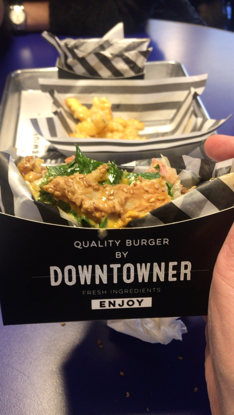 햄버거를 담고 있는 박스가 인상적이었다. 처음에는 햄버거를 감싸기에 종이 포장이 부족해서 이런직에 오픈된 형태로 서빙이 되나 싶었다. 분명 이렇게 나오는데는 비쥬얼 효과도 있었다. 먹다보니 왜 이런 종이 박스가 필요한지 알게 되었다. 육즙이 계속 흘러나오다보니, 이 박스에 흘렀던 육즙이 자연스럽게 담길 수 있었다. 실용적인 목적도 있었던 것이다.