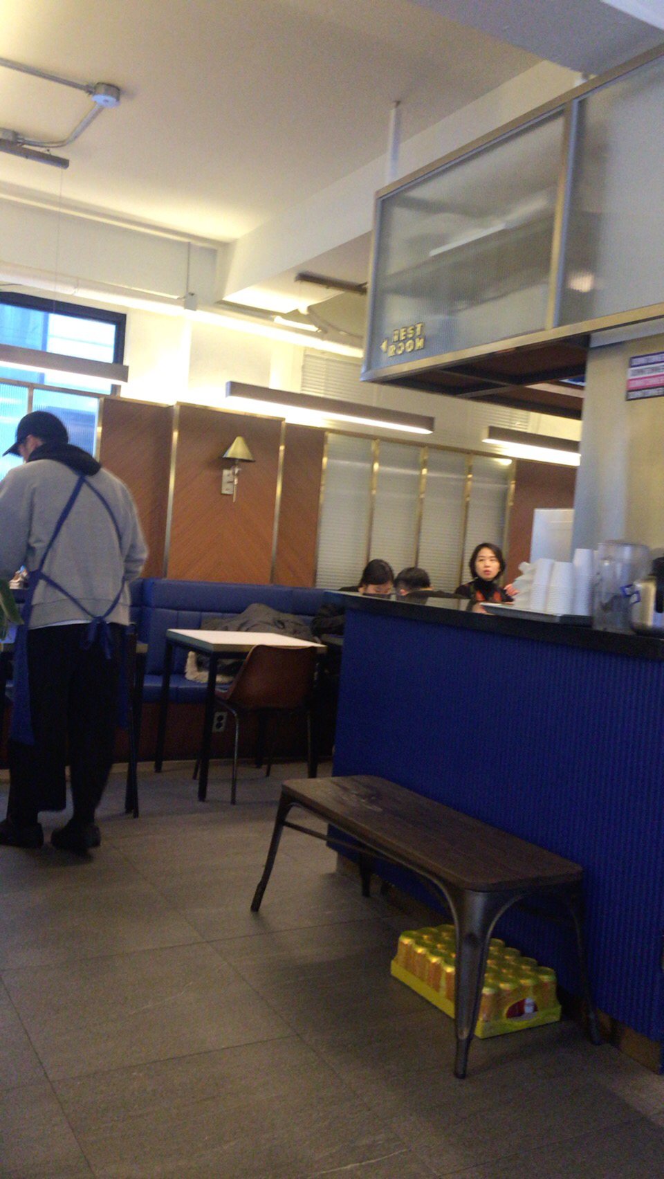 원래 이태원이 본점이라고 한다. 청담점은 일종의 분점인데, 이태원을 가보진 않았지만 실내는 비슷하게 꾸며놨다고 한다. 테이블, 의자, 조명들이 모던한 느낌을 준다. 실내가 크진 않아서인지 2인 또는 4인 기준의 테이블이 여기저기 놓여져 있었다. 30분 정도 앉아있었는데, 테이블당 회전율은 높은 편이었다. 그리고 오픈형 키친으로 되어 있어 테이블에서 조리하는 모습을 볼 수 있었다. 패티를 굽는 모습을 보니 왠지 스타벅스에서 주문을 받아서 커피를 내리는 것 같이 분주하지만 체계적으로 움직였다.