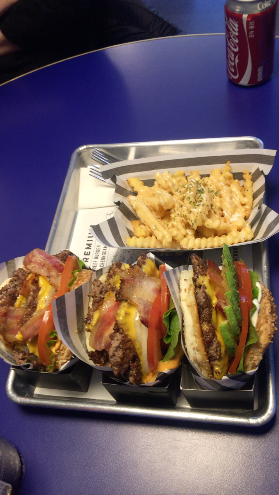 더블베이컨은 11,800원, 아보카도는 9,300원, 갈리버터는 6,300원이었따. 콜라와 스프라이트가 2,500원하니 세명 기준으로 46,700원이 나왔다. 분명 저럼한 가격은 아닌데 비교 대상을 쉑쉑버거라고 생각해보니 그리 부담스러운 가격은 아닌 것 같았다.