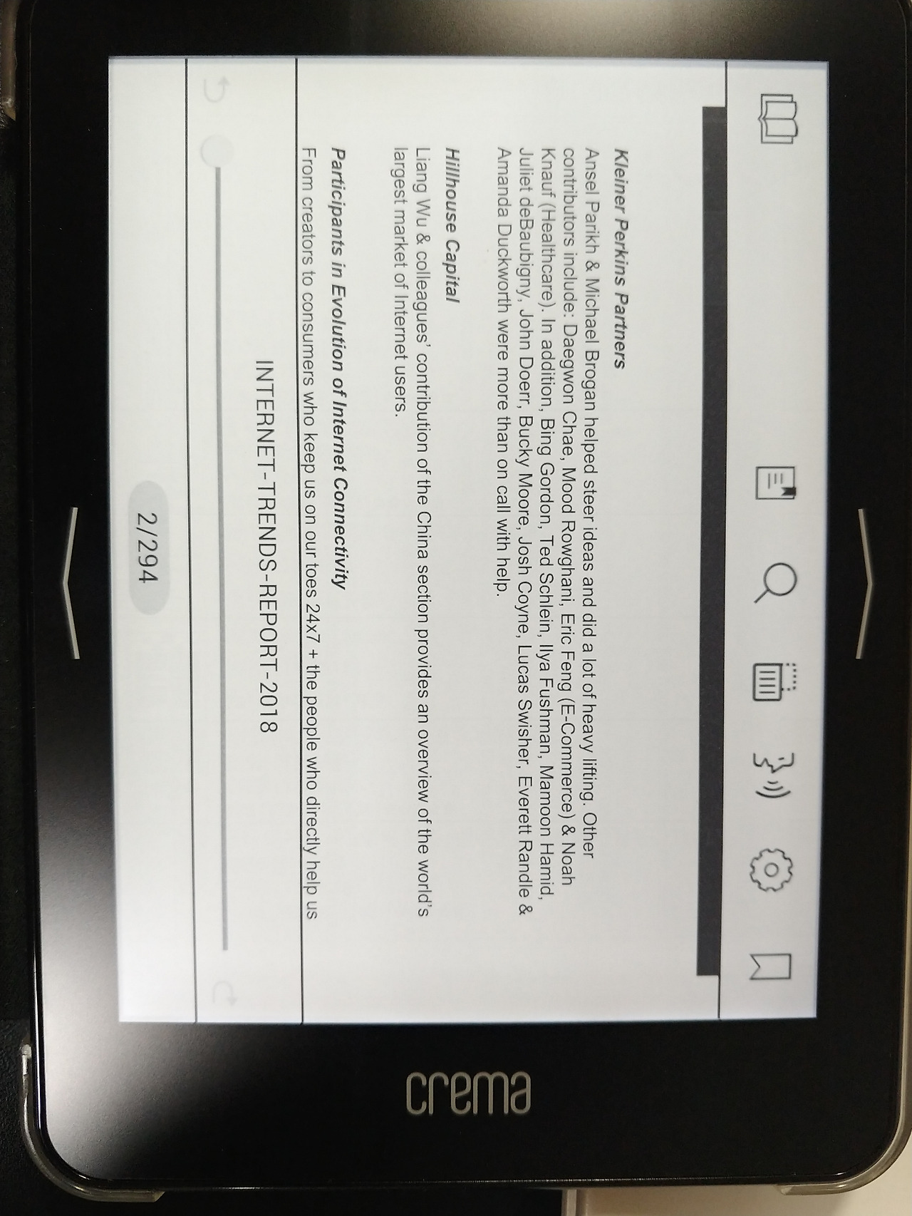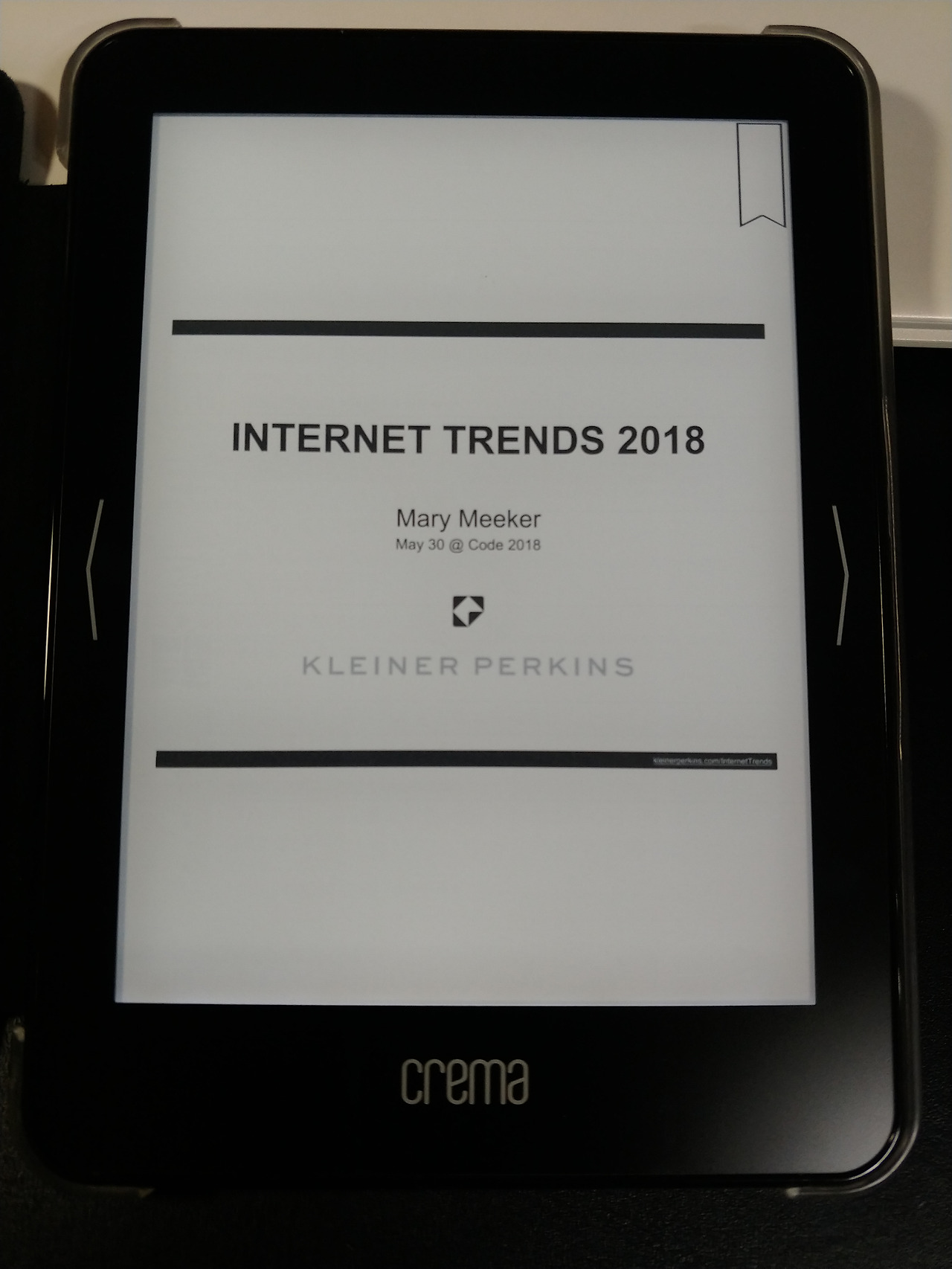 3) PPT: 깨알 같은 일반 보고 PPT는 가독성이 떨어지긴 했지만 불릿 포인트로 큼직큼직하게 써놓은 발표 자료스러운 문서는 읽기 편했다. Internet Trend 2018을 가로보기로 해놓고 출퇴근길에 읽었는데 확실히 PC 모니터나 프린트해서 보는 것보다는 훨씬 집중도 잘됐고 읽는 양도 늘었다