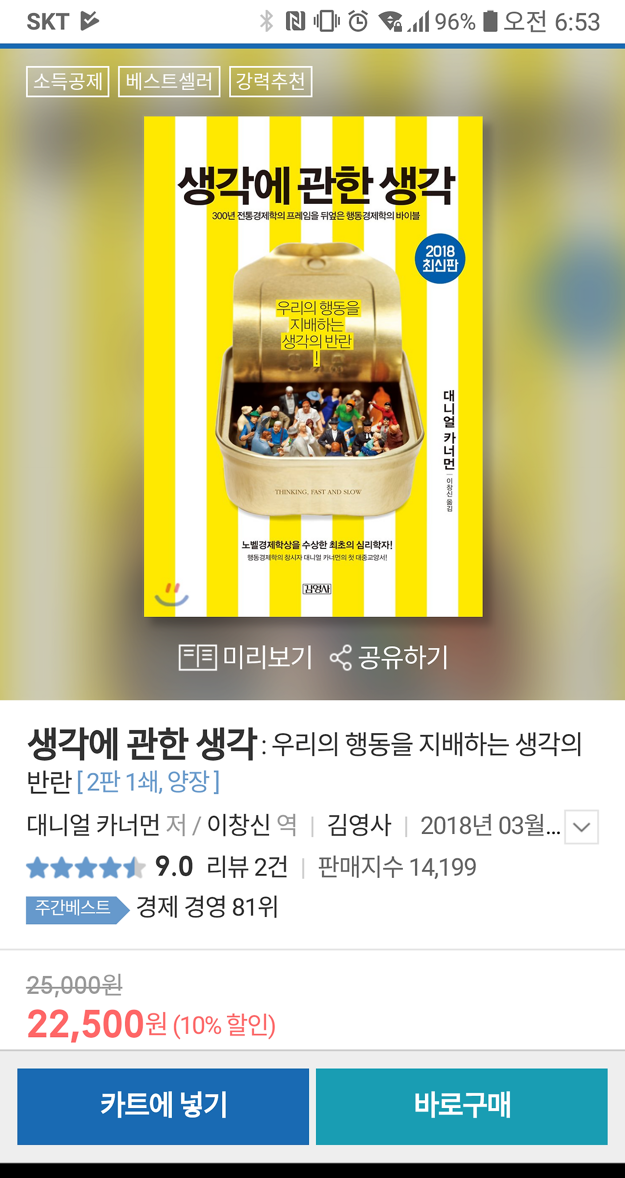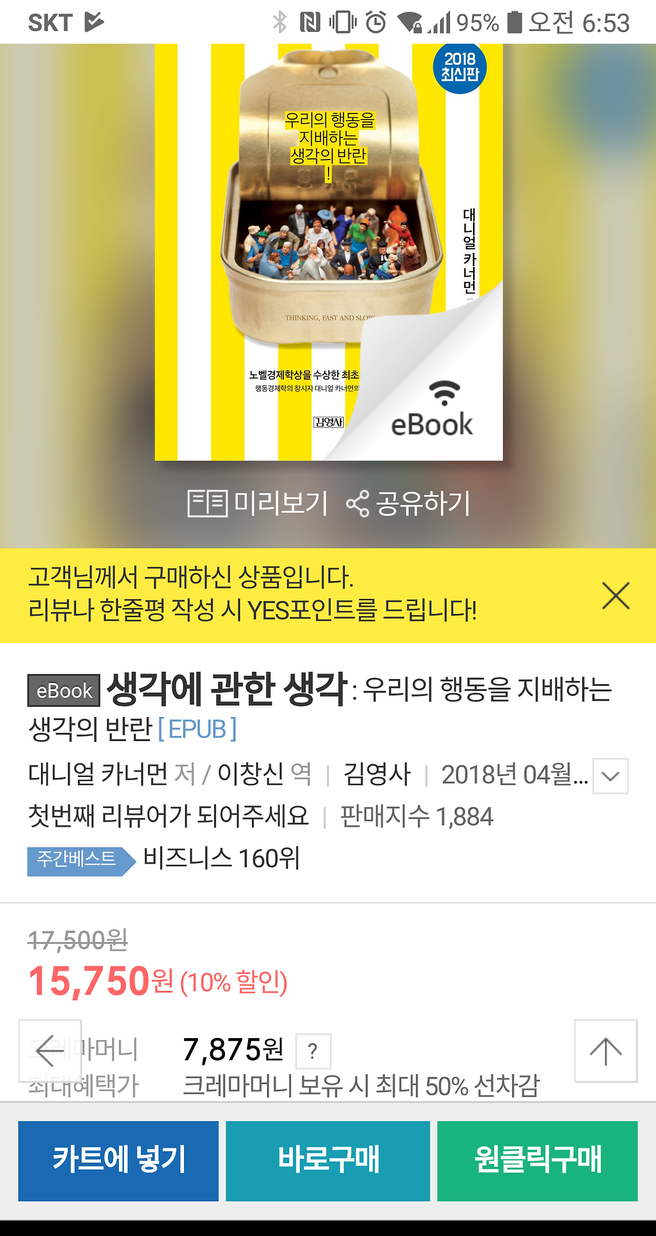 - 아무리 도서 정가제 때문에 할인판매가 줄었다고 하지만, 기대했던 할인율보다 높지 않았다. 게다가 요즘 중고서적 매입을 고려해보면 이 정도 차이로 이북이 일반 책 대비 싸다고 보기 어렵다.