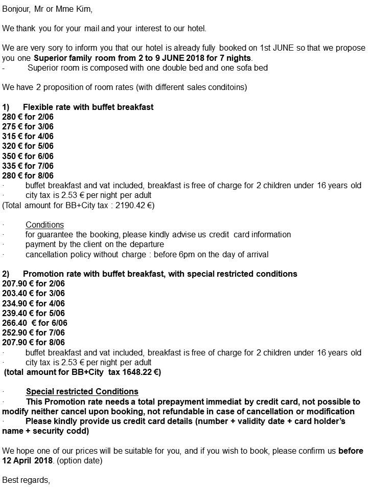출장 다니면서 제일 괜찮았던 에펠탑 근쳐 센강 앞에 있던 호텔을 예약하기로 했다. 문제는 금요일 체크인해서 다음 주 토요일 체크아웃 일정으로 알아보다 보니, 금요일은 Full Booking이라 6/1일 금요일은 불가능했다. 결국 호텔 담당자에게 6/1~9일까지 예약을 요청했으나 불가능하다는 답변과 대신 6/2~9일까지 두 가지 옵션으로 예약 가능하다는 메일을 회신받았다. 여행 앱보다 5% 정도 더 싸고 한 그레이드가 좋은 방을 제안받았다. 다만 선금을 다 지불하고 캔슬이 안된다는 부담이 있긴 했으나, 저 기간에 가지 않으면 휴가 자체를 갈 수 없을 것 같아 이틀 뒤에 예약 컨펌을 요청하고 카드 결제를 진행했다