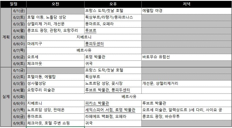 *계획: 에펠탑, 노트르담, 뤽상부르, 라텡가,몽파르나스, 샹젤리제 거리, 개선문, 몽마르트르, 오페라, 콩코드 광장, 오랑주리, 루브르, 지베르니, 마레지구, 퐁피두센터, 베르사유, 오르세, 로뎅 박물관, 바토무슈