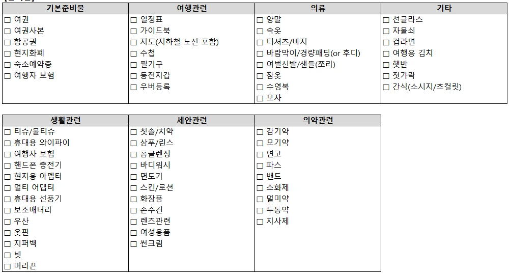 필요한 아이템은 떠나기 2주 전에 본격적으로 챙기기 시작했다. 마침 검색하다가 가족 해외여행 준비물을 잘 정리한 블로그를 별견해서 그걸 기본적으로 사용했다. 거기에 우리 가족들에게 필요한걸 하나둘씩 추가해서 리스트는 어렵지 않게 작성했다. 그 뒤에 트렁크에 짐을 싸는 건 어렵지 않았다. 마지막 날 짐을 정리하고 밤에 큰 트렁크 두 개를 쳐다보니 진짜 여행 가는 게 실감 났다.