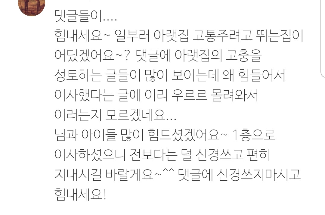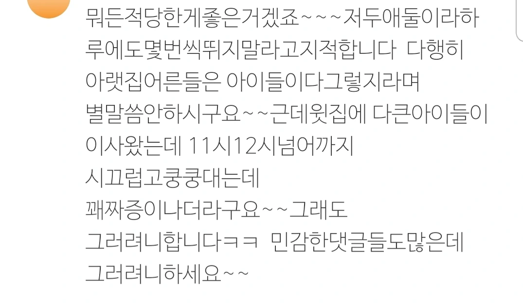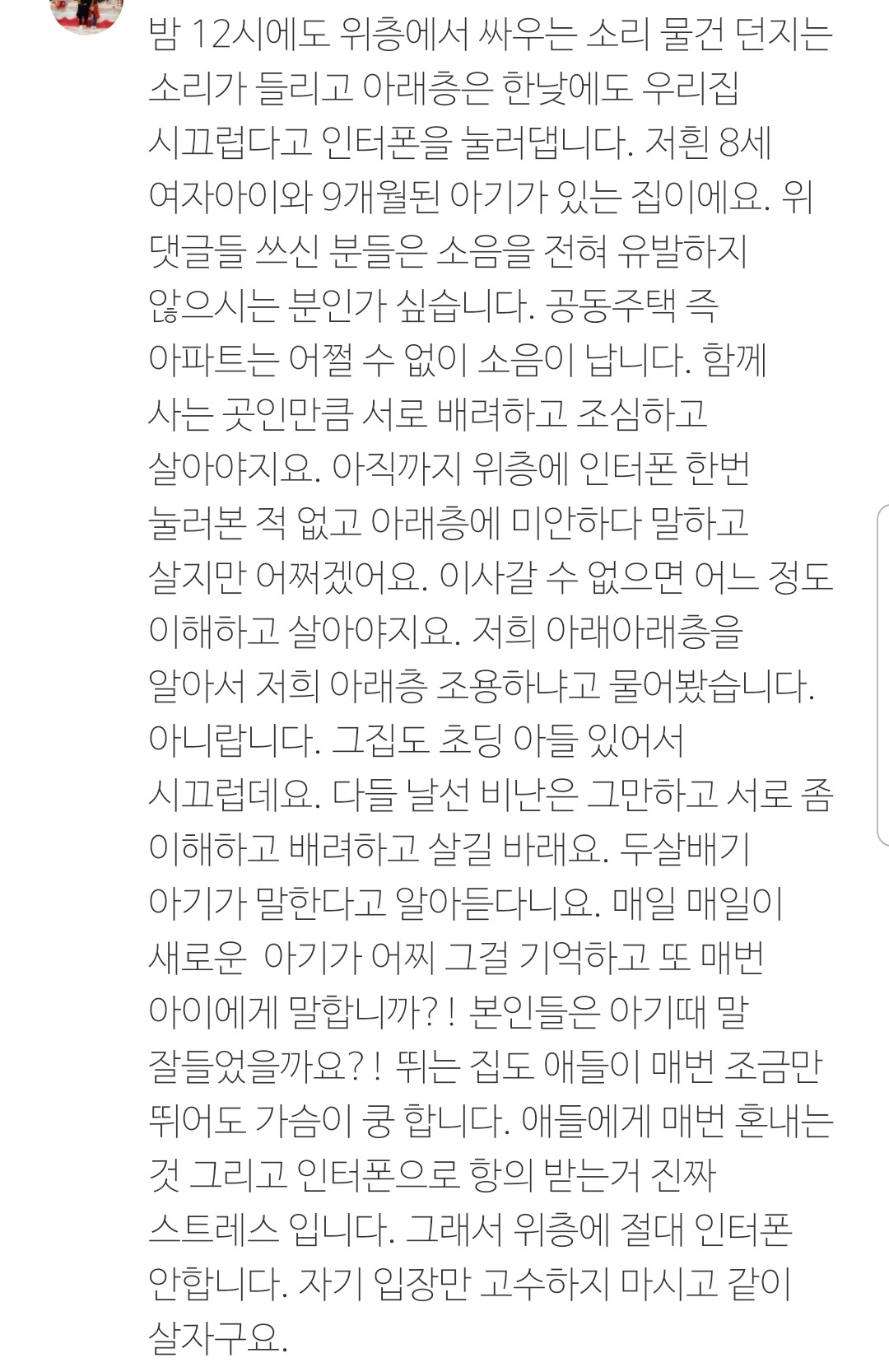 나에게 아이를 묶어둘 용기는 없었기에 분명 어느 정도의 소음은 발생했으리라는 것, 그건 충분히 인정한다. 하지만 아이들을 뛰도록 그냥 내버려 둔 적은 결코 없었으며, 아이들에게도 뛰면 아랫집에 피해를 준다는 점을 정말로 수도 없이 귀에 딱지가 앉도록 이야기하고 교육시켰다. 해도 해도 안되어 결국엔 이사까지 했다. 그런 점들을 글로 모조리 남겼다. 그런데도 날 선 비난의 댓글을 남기신 분들은 내 글의 어떤 점이 거슬렸던 것일까?