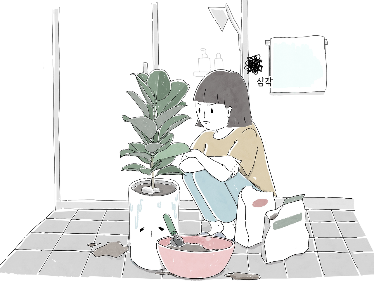 마치 시간여행을 한 듯, 다시 욕실에 쪼그려 앉아, 같은 식물을 분갈이해주는 나의 모습은…