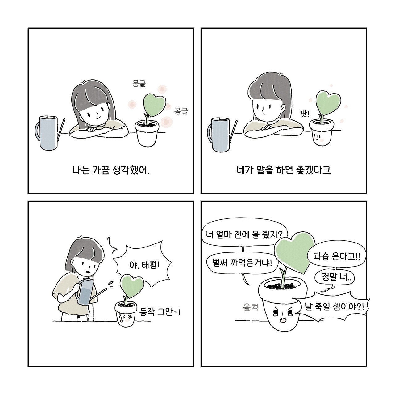 식물을 키울 때 이런 생각이 머리를 스치면 얼마 못 가 그 염려는 곧 현실이 되고 말았다. 영화로 비유하자면 등장 인물이 비극적인 상황이 오고 있음을 직감하지 못하고 끝내 죽음에 이르는 클리셰와 비슷하다. 단순히 기우일 거라 생 각하고 넘겨버리면 비극은 어김없이 찾아왔다. 만일 그들이 말을 할 수 있다면 어땠을까?