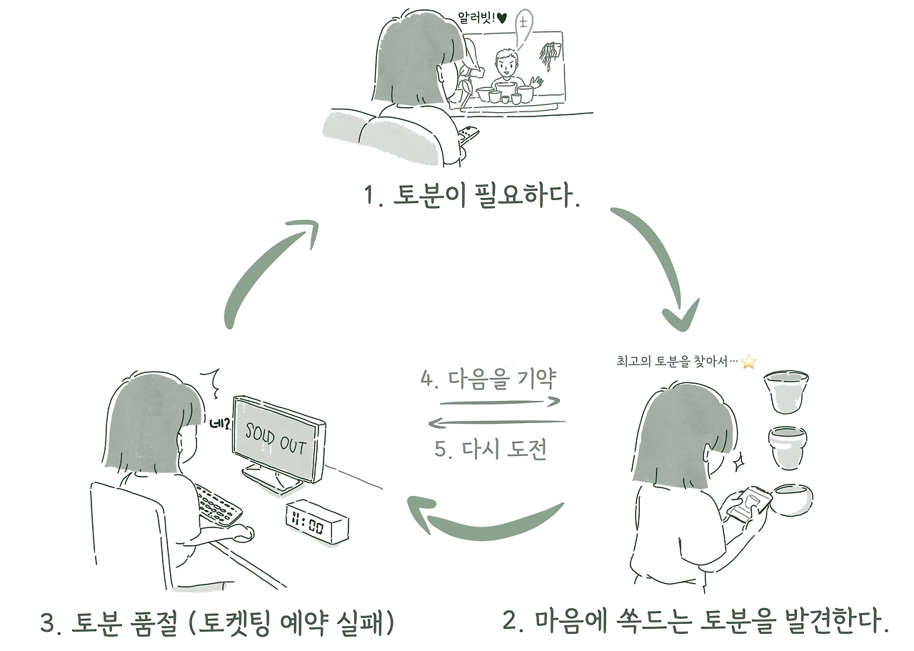 식물 집사들 사이에서 선풍적인 인기를 끄는 일부 유명 브랜드의 토분을 구매하기 위해서는 구매처를 방문 예약하는 과정이 반드시 필요하다. 즉 예약을 성공하는 자만이 토분을 구입할 수 있는 기회를 얻게 되는데, 이 티켓을 끊는 과정을 ‘토켓팅’이라고 한다.
