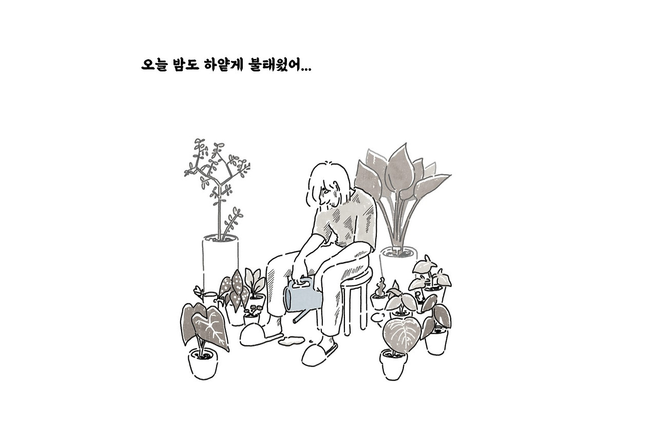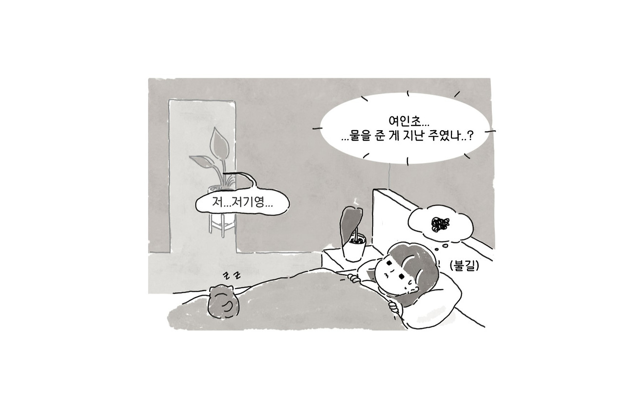 깊이 심호흡을 한 뒤 자리에서 일어나 조명을 켜고, 여인초를 살피러 무거운 발걸음을 옮긴다. 불안한 마음을 애써 감추고 수분 측정기를 꺼내 여기저기 화분 속을 찔러본다. 예상대로 여인초는 속흙까지 포슬포슬하게 말라있다. 무거운 여인초 화분을 화장실로 겨우 옮겨 물을 준 뒤 화분 속 물이 충분히 빠지길 기다린다. 동시에 물이 필요한 다른 식물들은 없는지 순찰을 돌고, 물 주기가 필요한 수십 개의 화분을 더 추려 화장실로 데려와 물을 준다. 식물에게 물만 줬을 뿐인데… 시간은 어느덧 새벽 한 시가 넘어버렸다.
