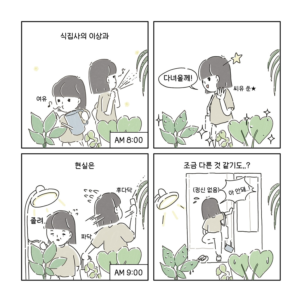 가끔 드라마에 회장님이 한 손에 분무기나 손수건을 들고서 아끼는 난초를 가꾸며 콧노래를 흥얼거리는 장면이 등장한다. 식물을 키우기 전, 상상했던 식물 집사의 루틴도 비슷했다. 드라마 속 회장님처럼 여유롭게 공중 분무를 해준 뒤, 식물들이 따사로운 햇볕을 마음껏 만끽할 수 있도록 창문을 활짝 열고 아침을 맞이하는 그런 상상.