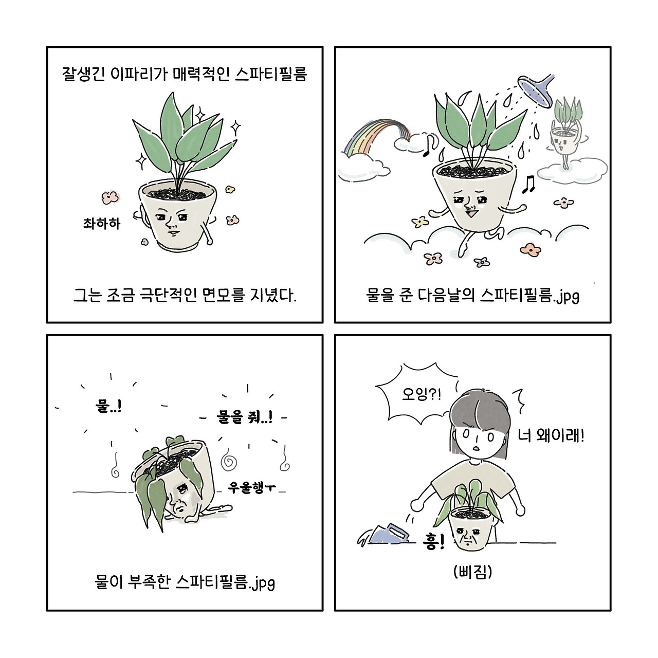 그렇게 물을 챙겨준 지 며칠이 지나자 그는 아무 일도 없었다는 듯 다시 잘생긴 스파티필름으로 돌아왔다. 이파리 끝이 조금 타긴 했지만, 이전처럼 하늘 높이 날렵한 이파리를 들어 올리며 잘생긴 미모를 자랑하기 시작했다.