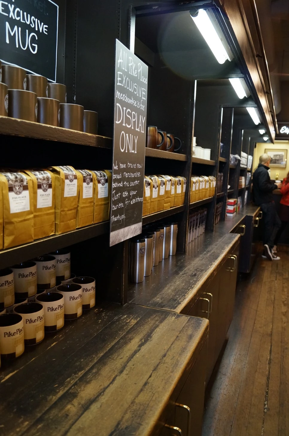 그렇게 공포감을 느낀 나의 첫 방문과 첫 주문이 마무리가 되고 본격적으로 매장을 가벼운 마음으로 둘러보았다. 처음 하워드 슐츠가 이곳을 방문했을때의 스타벅스는 어떤 모습이었을까. 아마도 안쪽에 에스프레소 머신은 처음에는 없었겠지. 지금보다 원두봉투가 훨씬 더 많이 진열 되어있고 수동으로 내리는 핸드드립 기구들이 더 많이 있었겠지...