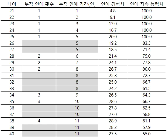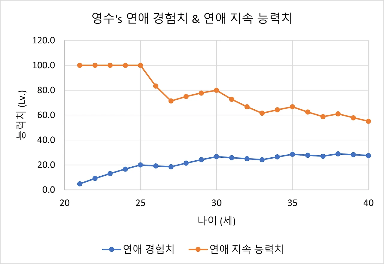 아래 표와 그래프는 위에서 예시로 든 영수의 경우 [연애 경험치]와 [연애 지속 능력치]이다.