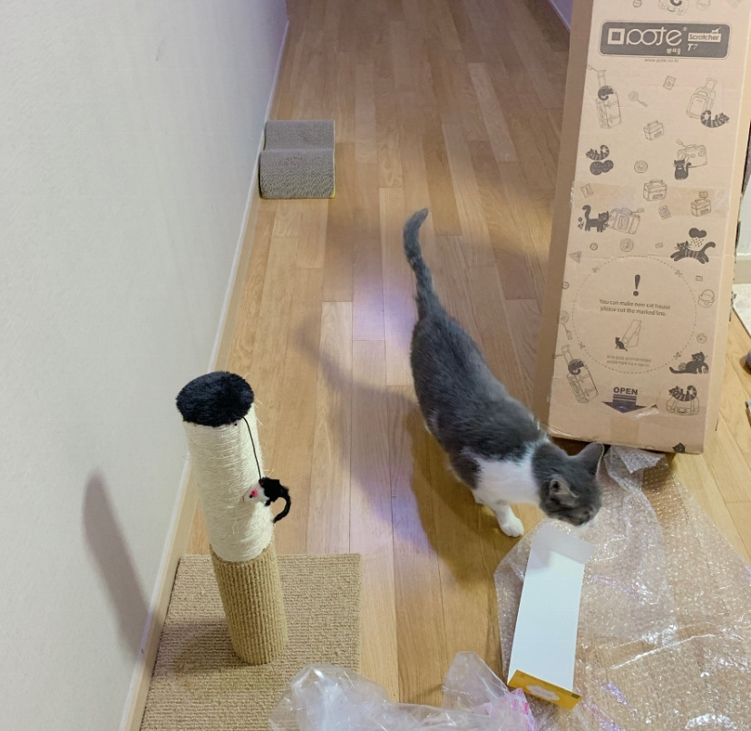 "내 새로운 스크래쳐가 온 것이냐? 어서 뜯어보지 않고 뭐하냐옹!!" 저는 이만 기니님의 새로운 스크래처를 오픈하러 가보겠습니다. 냥냥 -