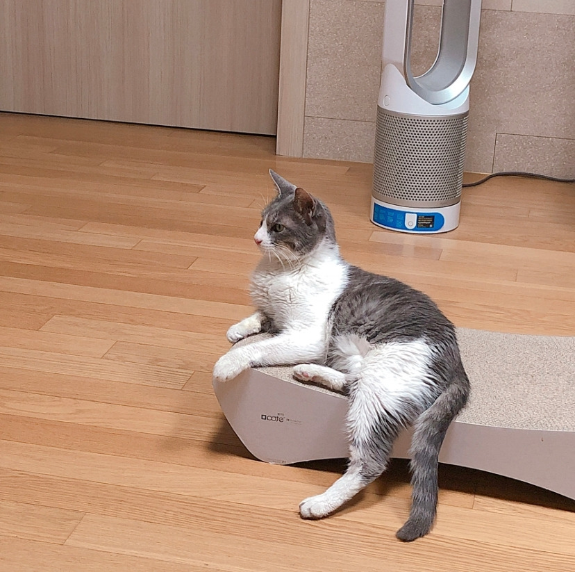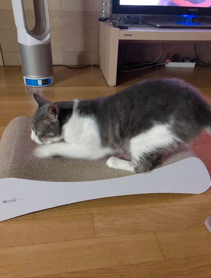 고양이들은 발톱으로 긁는 습관이 있어서 긁을 거리를 주변에 마련해줍니다. 기니는 스크래쳐를 굉장히 좋아해서 스크래쳐 위에서 거의 대부분의 시간을 보냅니다.