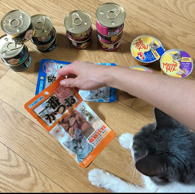 고양이의 주식 사료와 간식 등을 준비해둡니다. 건사료, 캔 사료, 습식사료, 간식 등 구비해두고 먹입니다.