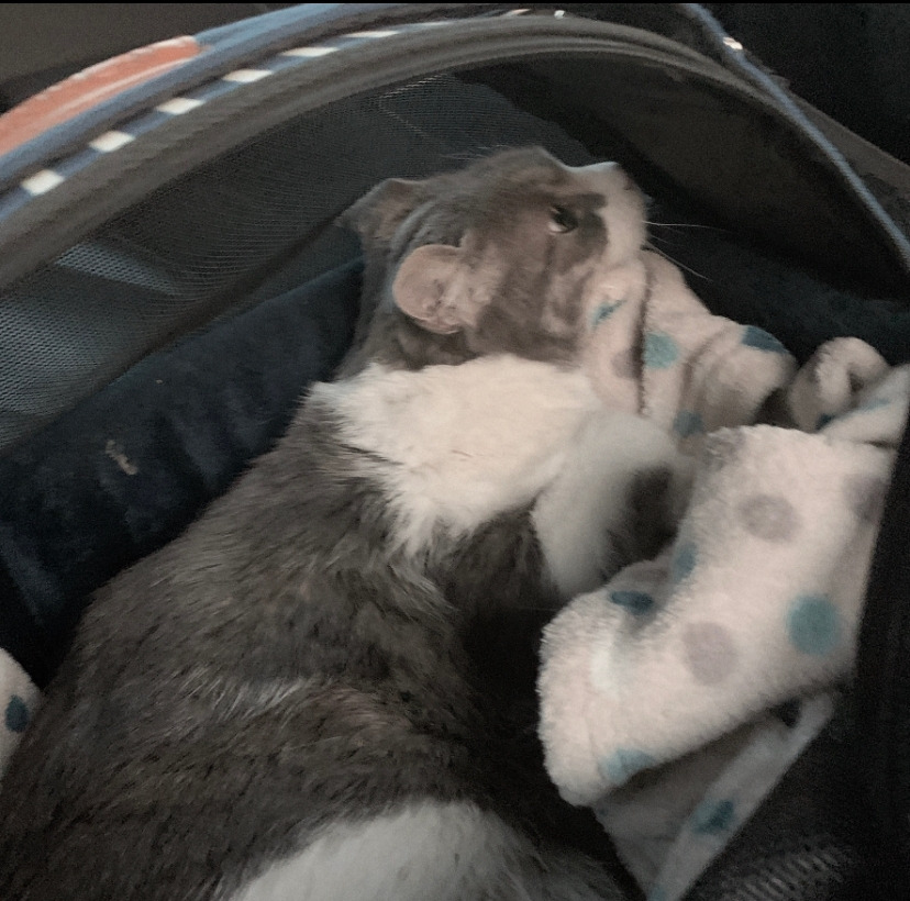 기니는 병원을 자주 왔다 갔다 해야 해서 이동장을 제일 먼저 구입했습니다. 고양이를 안전하게 데리고 다니기 위한 이동장으로 크고 환기가 잘되는 가방으로 구입했습니다. 이동장에 고양이가 평소에 좋아하는 담요를 넣어줌으로써 낯설지 않도록 합니다. (기니는 병원을 무척이나 가기 싫어해서 이 방법을 썼습니다.)