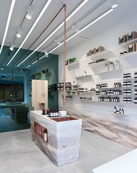 스톡홀름 플래그십 스토어와 비교해보면, 확실히 분위기가 다릅니다. 스톡홀름 플래그십 스토어의 콘셉트는 기능적인 공간을 먼저 설계하고 그 공간 사이에 해수와 모래의 흐름을 표현했다고 합니다. 매장 바닥 주위를 보면 물결치는 침식된 표면이 보이시죠?