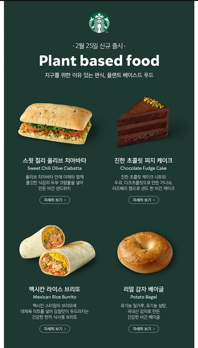 스타벅스가 국내 리워드 회원을 대상으로 조사한 결과 커피와 함께 식사 대용 또는 간식으로 선택할 수 있는 식물성 푸드에 대한 고객의 수요가 높게 나타나 반영했다고 합니다.
