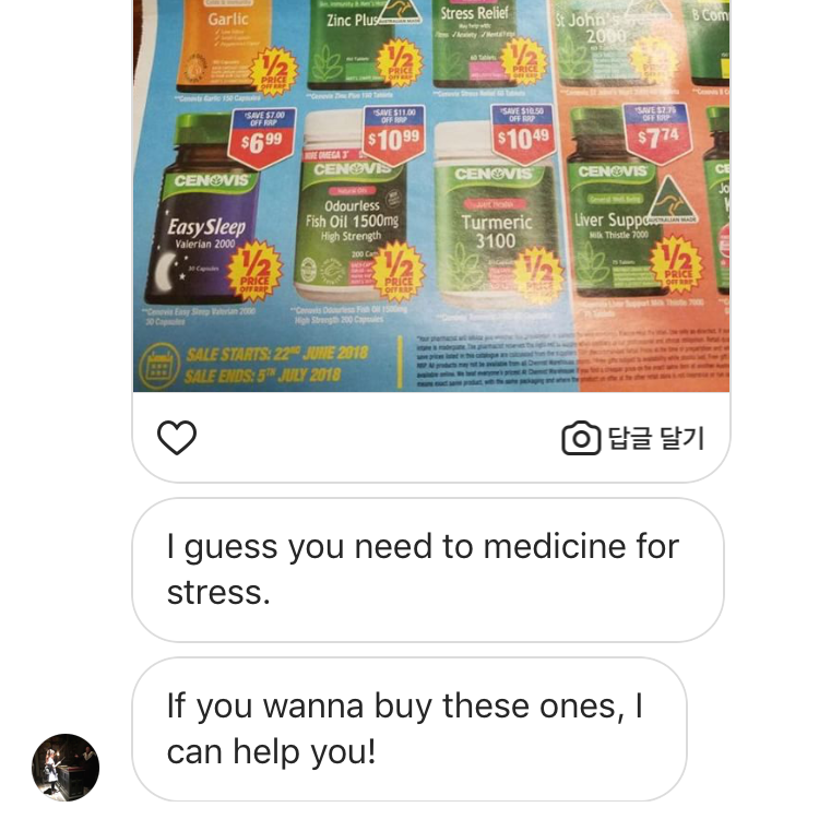 사진은 호주에서 유명한 CENOVIS 라는 브랜드의 영양제 홍보물이었는데요. 처음엔 사진만 보고 '대체 뭐지? 나한테 약 파는 건가?' 하고 잠시 생각하다가 메시지를 보니 이해가 가더라고요.