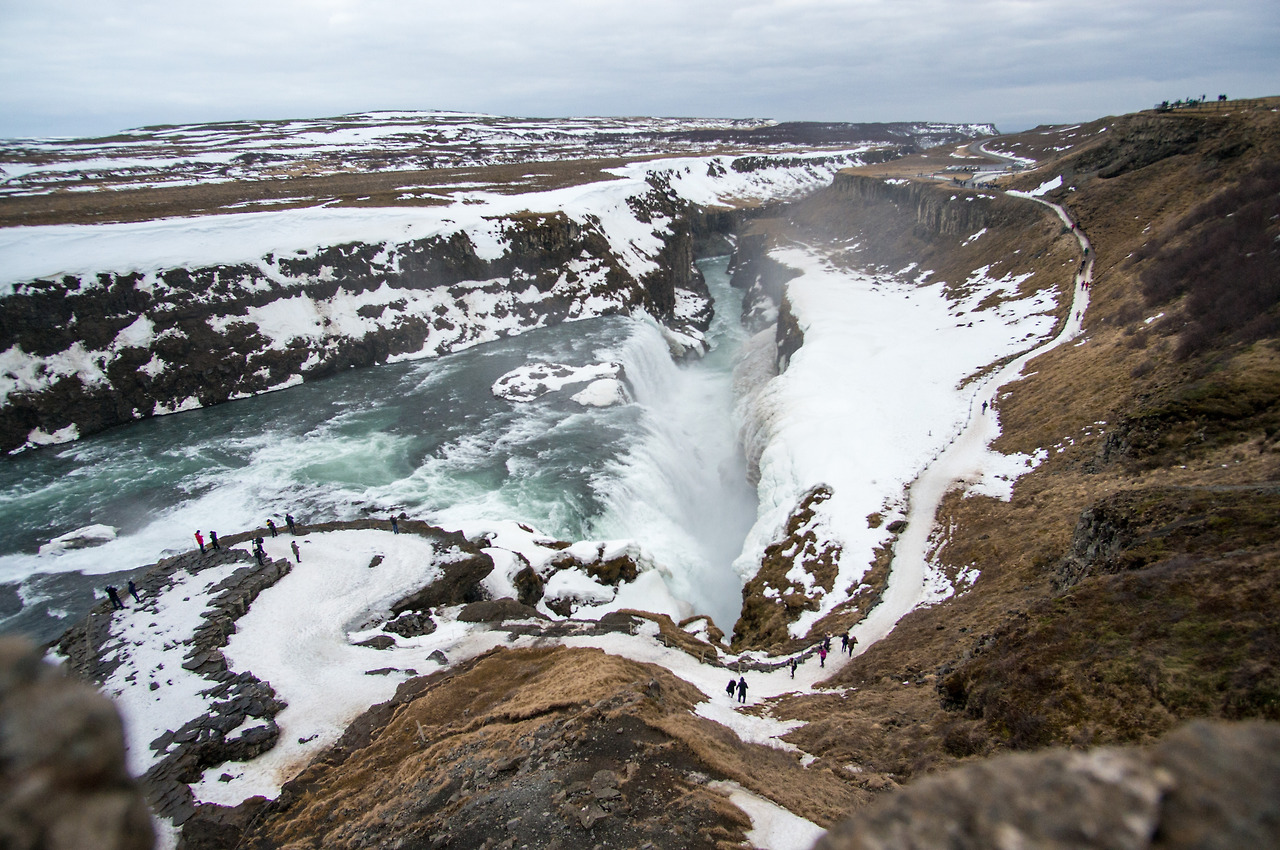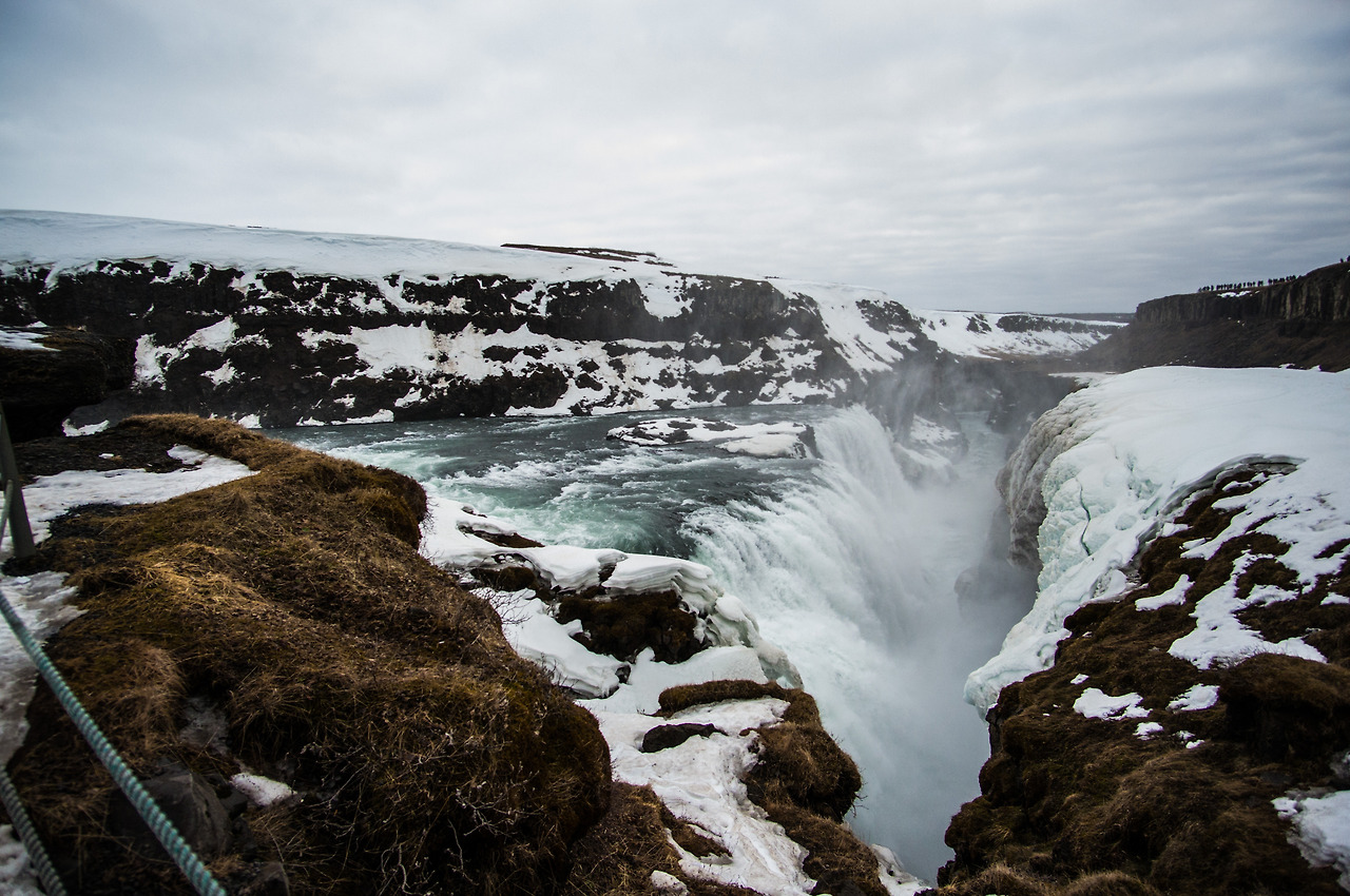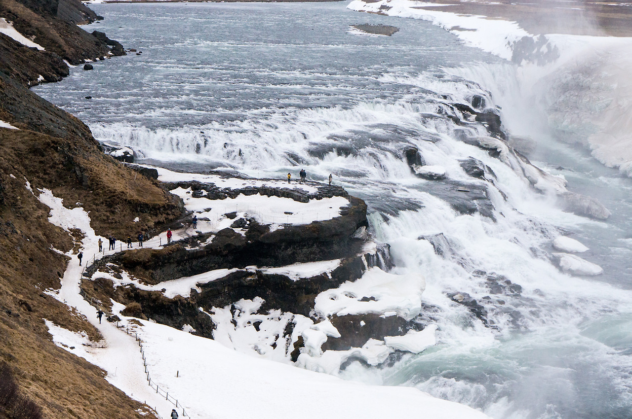 대체 이 많은 물이 어디에서부터 흘러들어오는 걸까. 솨아-하는 폭포 소리에 머리 속도 점차 하얗게 된다. 무서운 기세로 떨어지는 물과 그 주위로 피어난 희뿌연 물안개. 끝이 들여다 보이지 않는 바닥으로 물줄기를 내리꽂는 굴포스는 아름다우면서도 무서웠다. 저 속으로 들어가면 아무도 모르게 이 세상에서 사라질 것 같은 느낌이다. 좀 더 가까이에서 폭포를 보기 위해 길을 따라 내려가는데 얼음이 살짝 녹아서 굉장히 미끄러웠다. 조심조심 발을 내딛으며 조금씩 굴포스에 다가갔다.