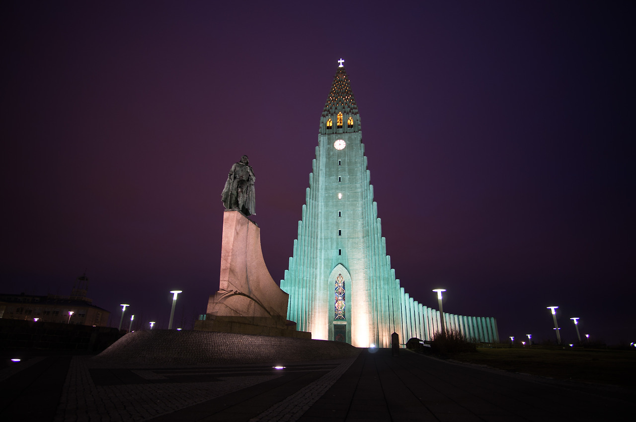 밤에 보는 레이캬비크는 낮의 모습과 조금 달랐다. 이 정도가 10대 교회 일리가 없다고 무시했던 할그림스 교회도 조명과 함께 있으니 훨씬 아름다워 보이고, 전망대도 낮에 본 모습 보다 더 예뻤다. 의도한 것인지 모르겠으나 조명의 색이 마치 오로라를 연상시킨다.
