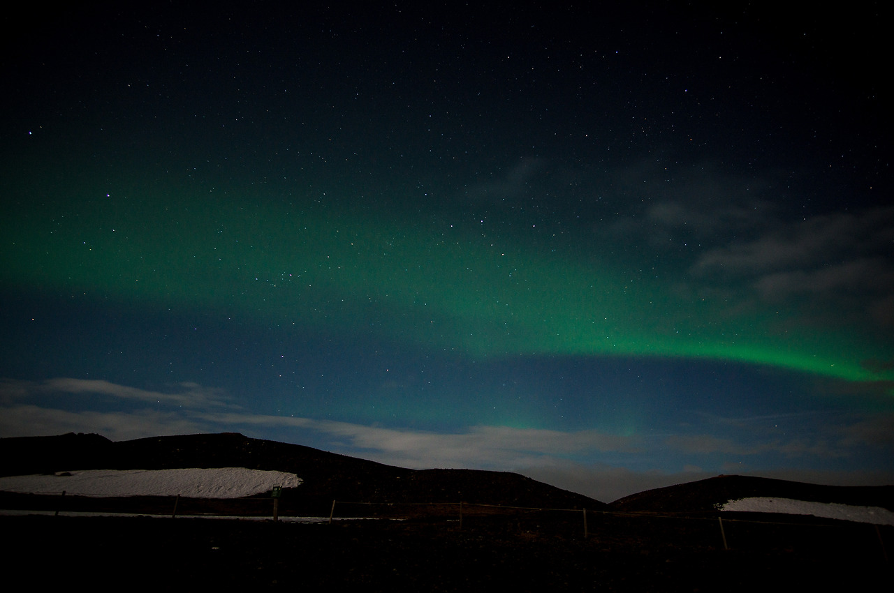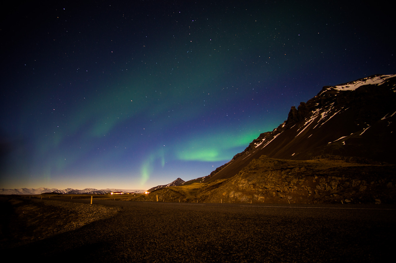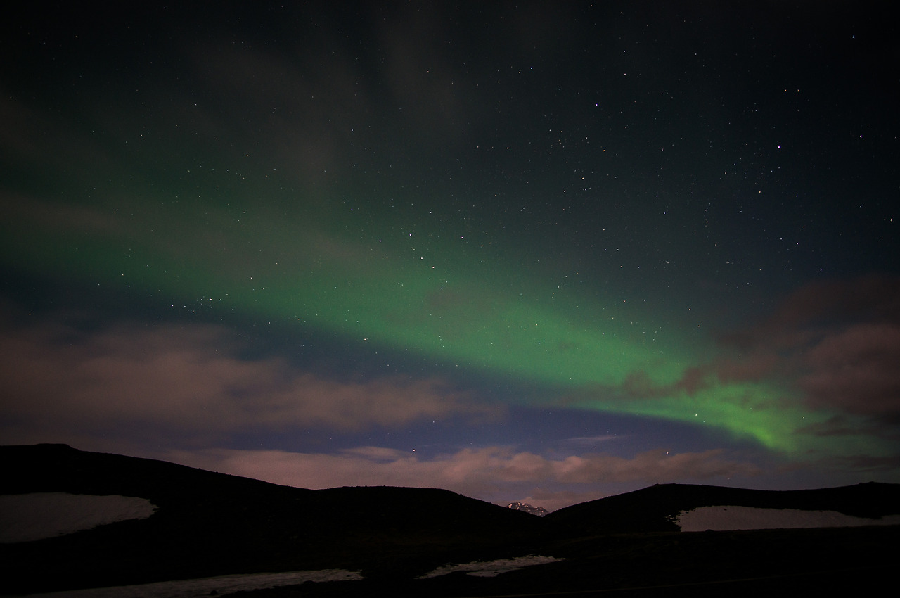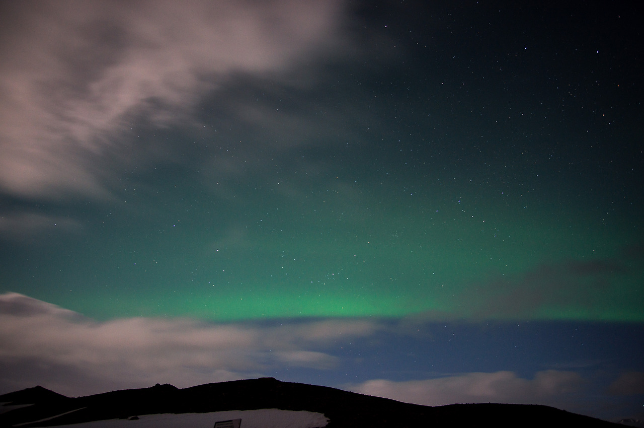 비몽사몽 차에서 내려 하늘을 봤을 땐 오로라를 보면서도 오로라인지 몰랐다. 맑은 하늘에 옅은 구름이 낀 듯 아주 희미한 무언가가 보일 뿐이었다. 한참을 들여다보고 있으니 구름이 아니라는 사실을 알 수 있었다. 구름은 사라지거나 갑자기 나타나진 않으니까. 카메라를 통해 장노출로 촬영해보니 초록색이 선명하게 나타났다. 내 눈 앞에 있는 오로라의 존재를 카메라를 통해 확인하고 난 뒤에야 오로라의 영롱한 초록색 빛깔이 조금씩 눈에 들어오기 시작한다.