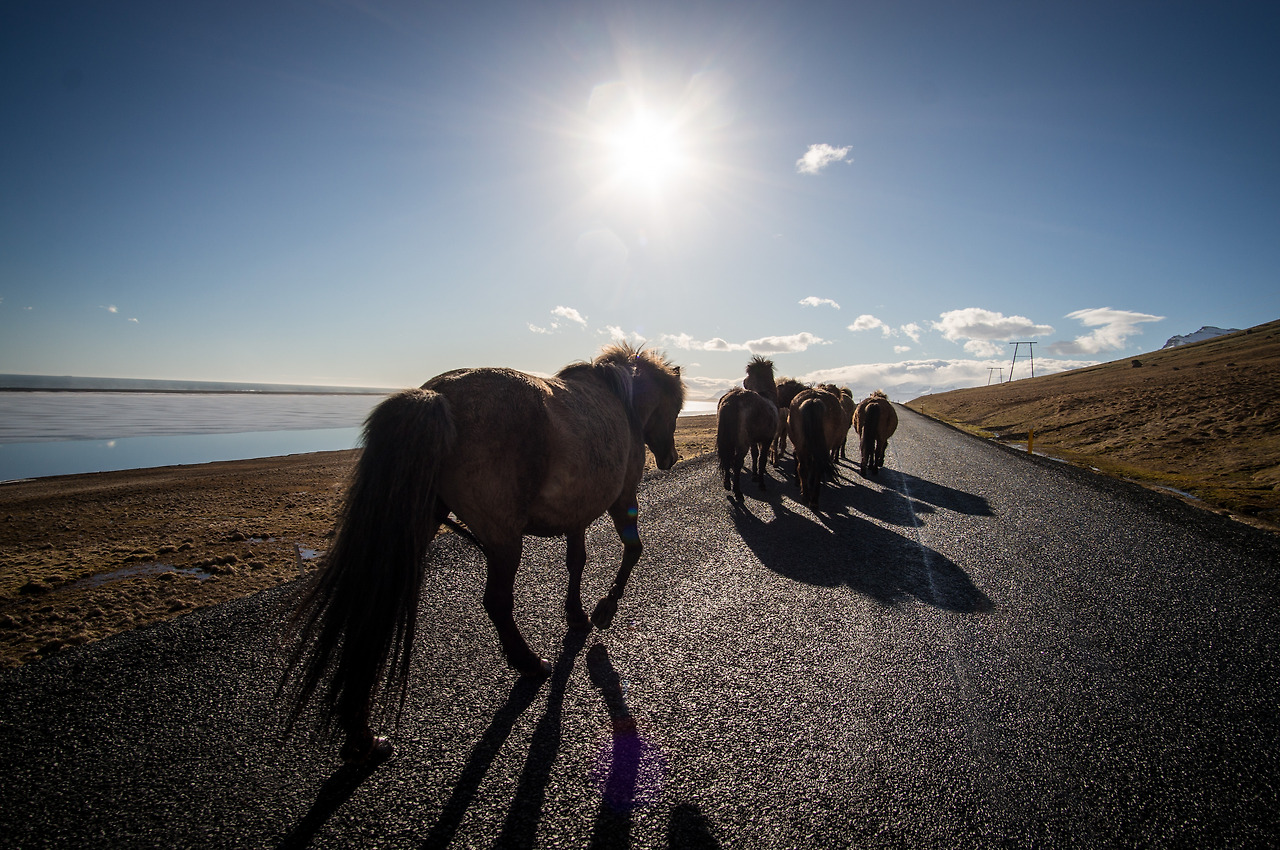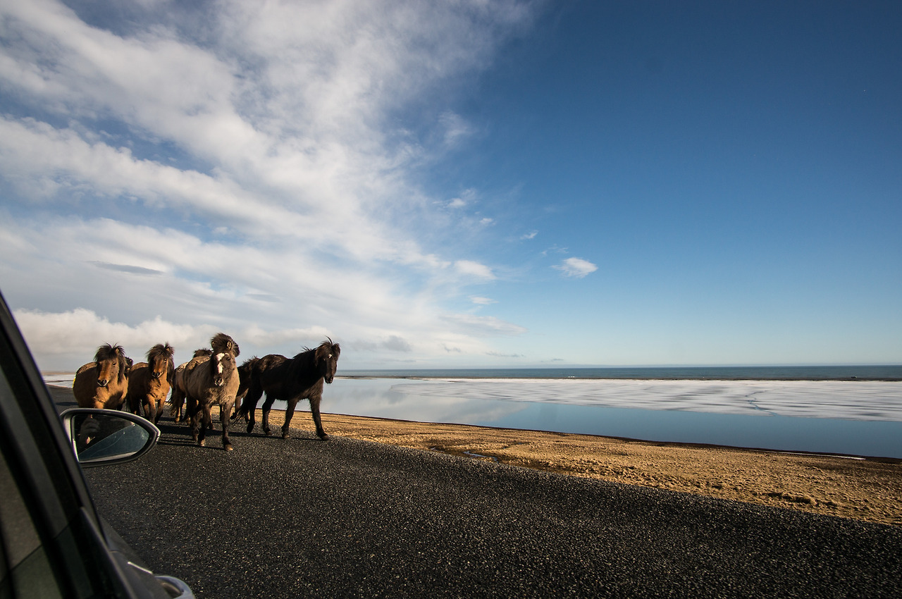 아주 자신감 넘치는 발걸음으로, 의기양양하게 보란 듯이 우리 바로 곁을 지나가는 말떼. 이 많은 말들을 이끄는 사람도 없었는데 이들은 대체 어디로 가는 걸까. 지루할 뻔했던 도로에 뜻밖의 선물까지 내려준 이곳 아이슬란드를 도저히 좋아하지 않을 수 없었다.