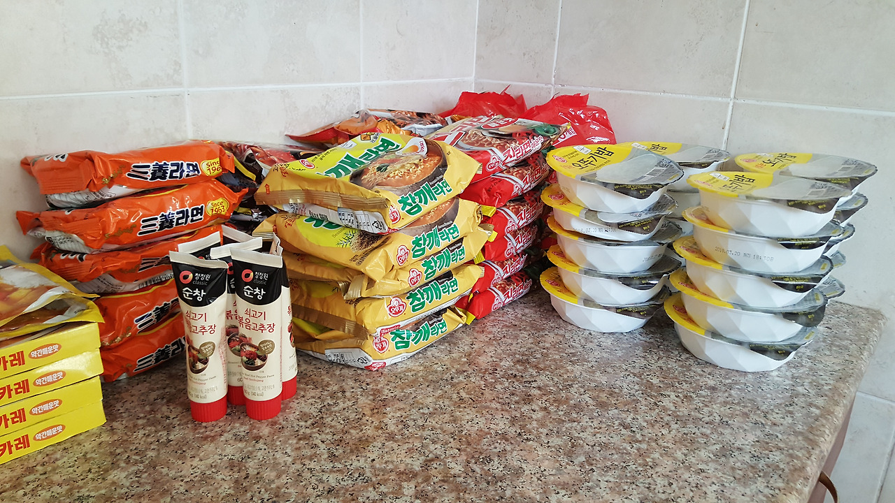 내가 특별히 편식을 많이 하는 편은 아니지만, '아프리카 현지식'이 입에 잘 맞지 않을까 봐 걱정이 되었다. 간이 하나도 안되어있는 옥수수죽이나 퍽퍽한 빵을 처음 보는 소스에 찍어 먹는다거나, 아니면 고기 하나 없이 풀만 먹을지도 모르니까. 그래서 우리 팀은 만반의 준비를 하기로 했다. 햇반, 라면부터 시작해서, 장조림, 깻잎까지 한국의 별미를 잔뜩 사갔고, 도착한 날 바로 부엌 싱크대에 쌓아놓고는 흐뭇하게 바라보았다.