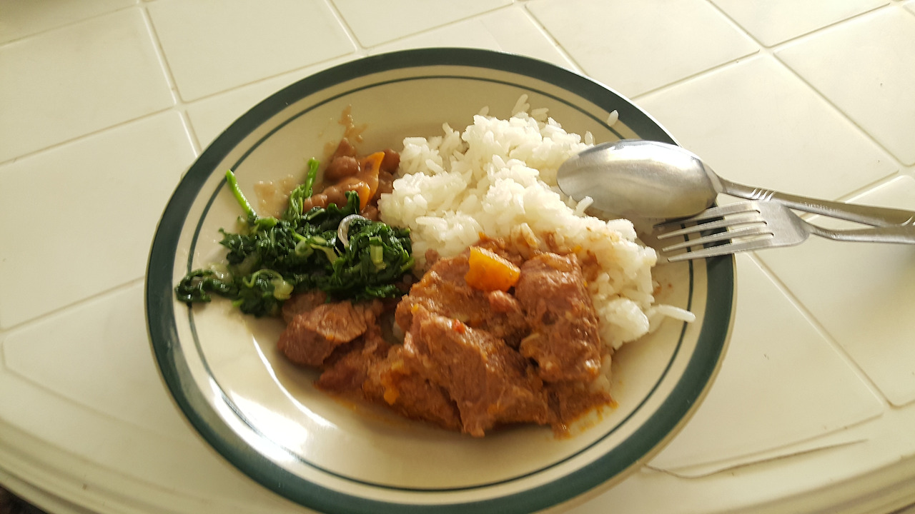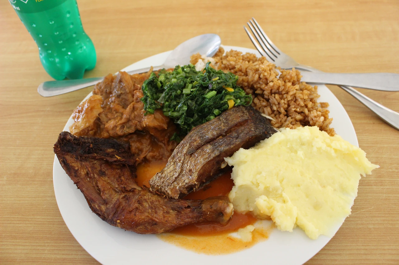 위 사진에 보이는 것이 우리가 처음 먹었던 현지 식사이다. 소금물로 씻어서 짭조름한 밥, 청국장 같은 비주얼의 콩 수프, 시금치처럼 생겼지만 맛은 조금 다른 야채, 그리고 고기 몇 점, 이렇게 한 식판에 담겨 나왔다. 푸짐한 밥의 양에 한 번 놀라고, 생각보다 먹을만해서 한 번 더 놀랐다. 고기는 우리나라에서 먹을 수 있는 급식 고기(?)와 비슷한 맛이고, 야채는 별 맛이 없었다. 콩은 너무 느끼해서 먹기 힘들어 처음엔 조금밖에 먹지 못했다. 반찬의 수가 많지는 않지만 밥이 간간해서 생각보다 잘 넘어간다. 꽤나 든든하게 식사를 했는데 2000실링, 우리나라 돈으로 약 천 원 정도의 가격이었다.