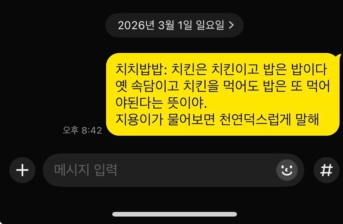 "치킨은 치킨이고 밥은 밥이라는 뜻이야! 치킨을 먹고 밥도 꼭 먹어야 한다는 의미지."
