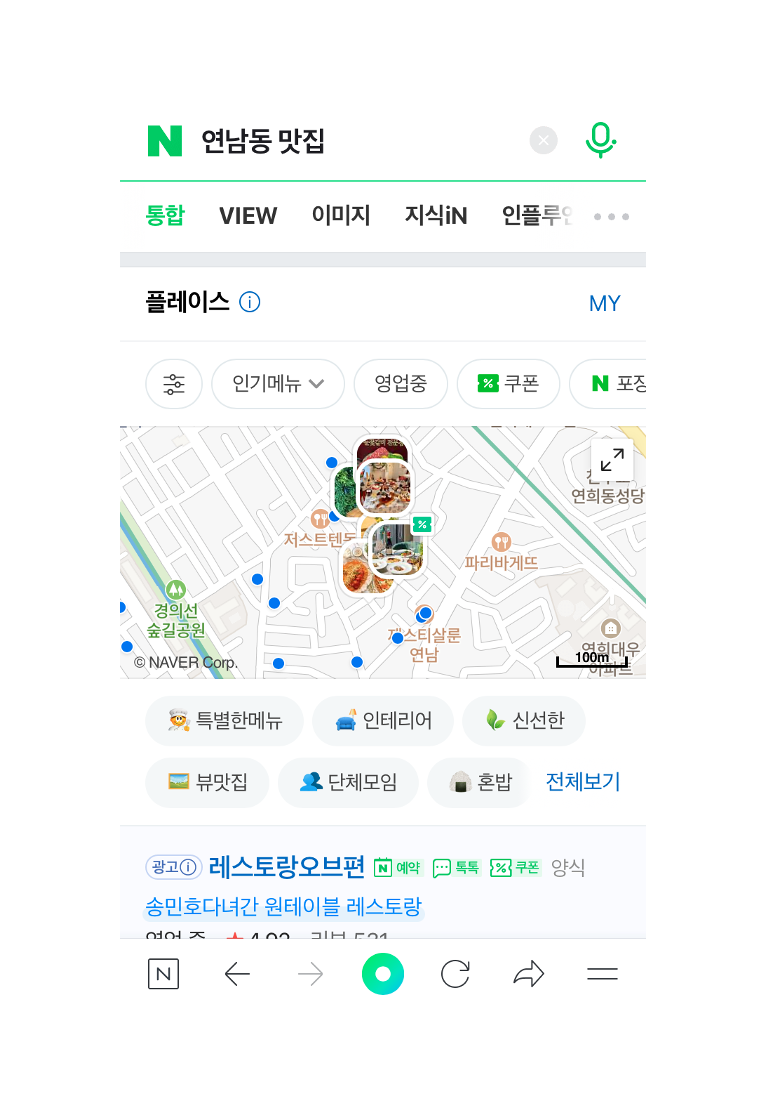 네이버 플레이스는 맛집 마케팅에서 가장 핫한 매체로 떠오르고 있습니다. 네이버는 사용자가 원하는 검색 결과를 가장 잘 노출시켜주기 위해, 검색어 타입에 따라 각 영역의 노출 순서를 조절합니다. 그중 맛집 관련 검색에서는 플레이스가 가장 상단에 노출됩니다. 또한 지도, 예약 등의 네이버 부가 기능이 잘 조합되어 있어, 절대 놓쳐서는 안 되는 마케팅 채널입니다.