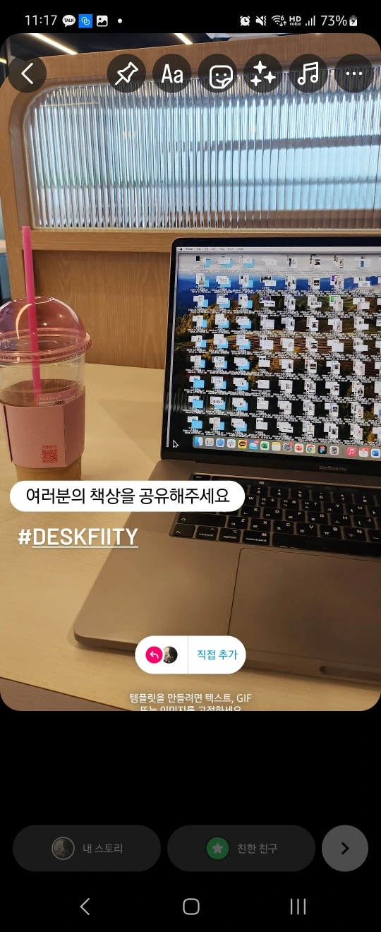 저는 ‘여러분의 책상을 공유해주세요.’ 라는 텍스트와 브랜드 이름인 #DESKFINITY를 입력했어요.