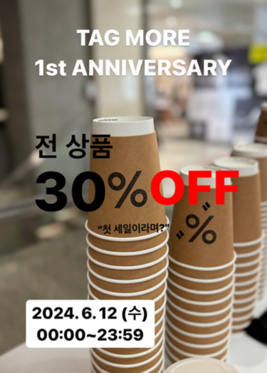 태그모어 1주년 기념으로 전 상품 30% 할인을 진행한다. 태그모어 첫 할인이다.